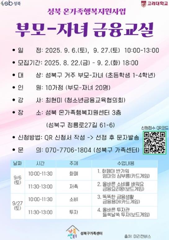 서울 성북구가 성북구 가족센터를 통해 운영한 ‘부모-자녀 금융교실’이 초등학생 자녀와 학부모들에게 높은 호응을 얻고 있다. 이번 프로그램은 총 3회에 걸쳐 진행됐으며, 100여 명이 넘는 참여자가 실생활 중심의 금융지식을 배우는 시간을 가졌다.‘부모-자녀 금융교실’은 부모와 자녀가 함께 교육을 받고 보드게임 등 활동에 참여함으로써 단순한 지식 전달을 넘어 가정 내 경제 소통의 기회를 만들었다는 점에서 의미가 크다.교육은 초등 저학년과 고학년을 대상으로 맞춤형 과정으로 구성됐다. 저학년은 ▲용돈 계산법 ▲은행 업무 이해 등을 배웠으며, 고학년은 ▲용돈기입장 작성법 ▲저축 방법 ▲화폐의 역사 등 경제 흐름에 대해 학습했다. 참여자들은 “아이에게 올바른 경제 습관 형성을 심어준 기회가 됐다”, “용돈을 스스로 관리하고 싶어졌다”는 긍정적인 소감을 밝혔다.9월 부모-자녀 금융교실은 오는 9월 6일과 27일 성북구 온가족행복지원센터에서 열리며, 참가 신청은 성북구 가족센터 홈페이지를 통해 할 수 있다.이승로 성북구청장은 “어릴 때부터 돈의 가치와 소비 습관을 제대로 형성하는 것이 중요하며, 앞으로도 가족이 함께 체험하며 배우는 교육 프로그램을 확대해 나가겠다”고 말했다.