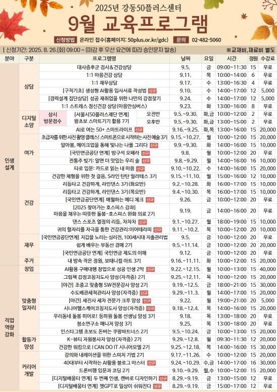 강동구는 강동50플러스센터가 8월 26일부터 9월 교육 프로그램 수강생을 모집한다고 밝혔다.2021년 10월 문을 연 강동50플러스센터는 개관 4년 만에 공식 누리집(홈페이지) 회원 수 5만 명을 돌파하는 등 중장년층의 높은 관심과 호응을 받아왔다. 구 전체 인구의 40%를 차지하는 중장년층을 위해 사회적 역할을 넓히고 건강한 노후설계를 돕는 다양한 맞춤형 프로그램을 운영하고 있다.이번 교육 과정은 인생 후반기 자기계발과 새로운 인생 경로 탐색을 위한 ‘인생 설계’ 분야와 중장년 세대의 특성과 수요를 반영한 일·활동 연계 교육인 ‘직업 역량 강화’ 분야로 나뉘어 총 41개 강좌에서 596명의 수강생을 모집한다. 특히, 디지털·건강·여가·일자리·커리어 개발 등 다양한 주제에서 16개의 신규 강좌가 개설되어 주목을 받고 있다.인생 설계 분야에서는 인공지능 활용 교육인 ‘AI로 여는 50+ 스마트 라이프’를 비롯해, ‘방구석 오페라’, ‘전통주 빚기’, ‘귀 혈자리 건강 관리’, ‘보태니컬 아트’ 등 25개 강좌가 마련됐다. 직업 역량 강화 분야에서는 ‘수도 배관 세척 관리사 양성’, ‘시니어 헬스 케어 코칭 지도사 양성’, ‘세차 전문가 크루 양성’, ‘40대부터 시작하는 AI 활용 블로그 마스터’ 등 자격증 취득형 및 실무형 강좌 16개가 운영된다.특히, 구는 전문 경력 설계 컨설턴트와의 1대1 상담·멘토링을 통해 수강생의 경력 설계와 맞춤형 교육, 진로 전환 및 일·활동 지원이 체계적으로 이어질 수 있도록 원스톱 지원 체계를 운영한다. 이를 위해 최근 관심이 높은 생성형 AI를 활용한 입사 서류 작성법 등 구직 기초 프로그램도 새롭게 편성했다.양미랑 교육지원과장은 “이번 교육 프로그램은 인생 후반기를 준비하는 중장년층에게 새로운 기회를 열어줄 좋은 기회가 될 것”이라며, “앞으로도 다양한 교육을 통해 인생 2막의 든든한 조력자가 되겠다˝라고 말했다.