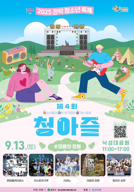 관악구가 오는 9월 13일 낙성대공원에서 2025 관악 청소년 축제 ‘제4회 청아즐(부제: 마음의 정원)’을 개최한다.올해로 4회째를 맞은 청아즐은 ‘청소년들이 아무 생각 없이 즐기는 축제’의 줄임말로, 청소년들이 직접 기획하고 참여해 열정과 창의성을 펼치는 관악구 대표 청소년 축제이다.‘마음의 정원’을 부제로 한 이번 축제는 학업에 지친 청소년들이 함께 모여 공감하고 휴식을 만끽하며 새로운 에너지를 얻을 수 있는 다양한 콘텐츠로 구성됐다.축제는 오전 11시 30분부터 진행되는 ‘K-POP 랜덤 플레이 댄스’로 문을 열어 현장에 열기를 더한다. 지난 7월부터 8월까지 실시된 참여자 모집에 사전 신청한 청소년 100여 명이 DJ가 무작위로 재생하는 케이(K)팝 음악에 맞춰 자유롭게 춤을 추며 축제 분위기를 뜨겁게 달굴 예정이다.이어지는 개막식에서는 청소년 축제기획단 ‘청티스트’와 박 구청장이 함께 ‘마음의 정원’을 여는 퍼포먼스를 선보이며 본격적인 축제의 시작을 알린다.이후 축제 본무대에서는 ▲댄스팀(CB크루, 라스트릿크루) 공연 ▲청소년 동아리 공연 ▲아이돌(리센느) 축하공연 등 열정적인 무대로 청소년들과 관람객을 매료시킬 예정이다.무대 밖 공간에서도 다채로운 체험을 제공한다. ‘마음의 정원’ 콘셉트로 운영되는 ‘힐링존’에는 ▲고민 나눔존 ▲심리 상담존 ▲아트 힐링존 ▲펀펀 스트레스 해소존 ▲포토존 ▲정원 라디오 등 다양한 힐링 콘텐츠를 즐길 수 있다.이 외에도 구는 청소년 방과 후 활동과 연계한 ‘흥미진진 체험부스’와 학교별 특색을 살린 ‘학교 동아리 부스’ 등을 운영해 청소년과 관람객에게 즐거운 추억을 선사할 예정이다.박준희 구청장은 “청소년들이 학업 고민으로 무거운 일상의 긴장감을 잠시 내려놓고, 청아즐에서 자신을 마음껏 표현하며 끼와 열정을 발산하는 행복한 시간을 보낼 수 있기를 바란다”라고 전했다.