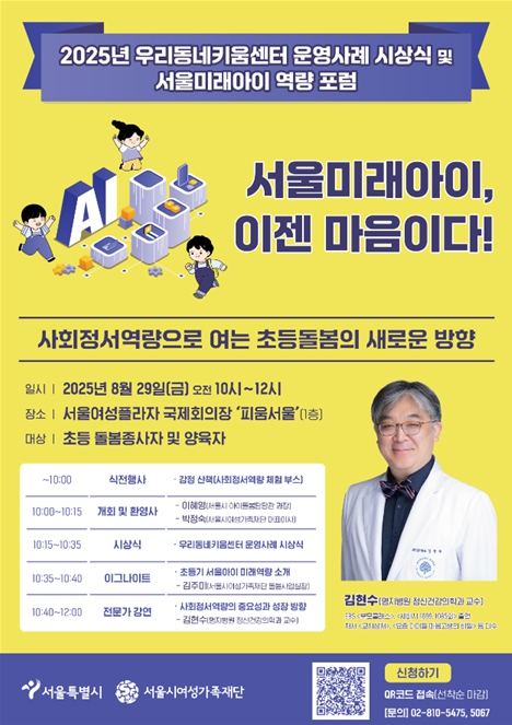 서울시여성가족재단은 오는 8월 29일 오전 10시 서울여성플라자 국제회의장에서 ‘서울미래아이, 이젠 마음이다!’를 주제로 우리동네키움센터 운영사례 시상식 및 서울미래아이 역량포럼을 개최한다고 밝혔다. 이번 행사는 미래 사회에서 아동 발달의 핵심으로 부각되는 사회정서역량을 중심에 두고, 초등돌봄기관 종사자와 양육자가 나아갈 방향을 모색하기 위해 마련됐다. 서울시의 방과 후 돌봄이 필요한 아동들을 위한 쉼·놀이 공간인 ‘우리동네키움센터’ 운영사례 공모전 시상식에서는 서울특별시장상 포함 총 10건의 우수사례가 선정·시상될 예정이다. 재단은 아동 최우선의 원칙(서울형 5C 활동)을 실현하기 위해 프로젝트 기반 배움 활동(PBL)과 센터 운영사례 두 분야를 운영원칙·독창성·현장 적용성을 기준으로 엄정히 심사했다. 특히, 아동참여 기반의 활동 기획, 지역사회와의 협력 등을 반영한 창의적인 운영 방식이 높은 평가를 받았다. 시상식 현장에서는 수상 사례를 전시 공간을 통해 소개하여 다른 기관과 종사자들이 참고할 수 있도록 할 예정이다. 이어지는 포럼에서는 김현수 교수(명지병원 정신건강의학과)가 ‘AX시대(인공지능 확산 시대)에 초등아동을 위한 사회정서역량 증진 방안’을 주제로 기조 강연을 진행한다. 김 교수는 느린 학습자(경계선 지능 아동) 지원과 학교폭력 예방 등 청소년 정신건강 분야 경험을 바탕으로, 돌봄기관과 가정에서 실천할 수 있는 구체적 방법을 제시할 예정이다. 부대 행사로는 △우리동네키움센터 우수사례 전시 △참가자가 자신의 감정을 알아보고 표현할 수 있는 체험 프로그램 ‘감정산책’이 마련된다. 특히 ‘감정산책’ 코너에서는 책갈피 속 문구를 선택해 현재 감정을 인식하고 표현하는 활동을 통해 사회정서역량의 기초 요소(자기인식·자기관리)를 직접 경험할 수 있다. 본 포럼은 관심 있는 시민이라면 누구나 행사에 참여할 수 있으며, 상세 안내는 서울시여성가족재단 공식 누리집 공지사항에서 확인할 수 있다. 박정숙 서울시여성가족재단 대표는 “이번 행사는 초등 돌봄 현장의 우수사례를 공유하고, 아동의 사회정서역량의 중요성을 알리기 위해 마련됐다. 변화가 빠른 미래사회, 특히 인간과 인공지능이 공존하는 시대에는 기술만으로는 해결할 수 없는 공감과 소통, 관계 형성 능력이 아동의 건강한 성장과 돌봄의 질을 좌우한다.”라며, “이번 강연과 전시를 통해 이러한 가치에 공감하고, 미래 역량 중심의 새로운 돌봄 모델이 확산되기를 기대한다”라고 말했다.