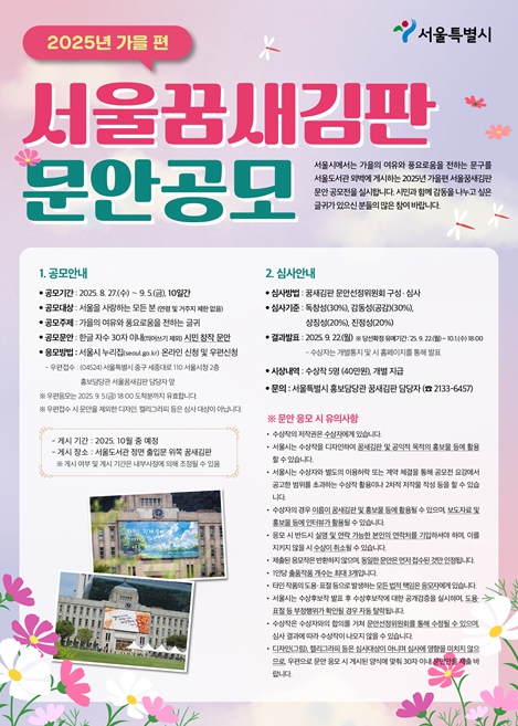 서울시가 ‘가을의 여유와 풍요로움’을 주제로 한 ‘2025년 가을편 서울 꿈새김판 문안 공모’를 8월 27일부터 9월 5일까지 10일간 진행한다. 서울시 누리집을 통한 온라인 신청과 우편 신청으로 참여할 수 있다. ‘서울꿈새김판’은 각박한 일상 속 시민에게 위로와 희망의 메시지를 전하고 시민의 삶 속에서 공감하는 메시지를 나누기 위해 지난 2013년 6월, 서울도서관 정면 외벽에 설치한 대형 글판이다. 서울꿈새김판 공모는 거주지역과 나이에 상관없이 서울을 사랑하는 사람이면 누구나 참여할 수 있으며 한글 30글자 이내의 창작 문안을 1인당 3개 작품까지 응모할 수 있다. 각각의 작품은 개별 접수해야 한다. 출품작은 내외부 위원으로 구성된 ‘문안선정위원회’에서 심사를 거쳐 최종 5개의 작품이 선정되며, 각 수상자에게는 각 40만 원의 상금이 개별 지급된다. 서울시는 수상작을 디자인하여 가을편 꿈새김판에 게시하고, 시민과 함께 소통하며 따뜻한 감동을 선사할 예정이다. 강선미 서울시 홍보담당관은 “시민들이 꿈새김판을 통해 긴 무더위에 지친 마음을 위로받고 가을의 여유와 포근함을 느꼈으면 좋겠다”며, “시민들의 많은 참여와 관심 바란다”고 말했다.