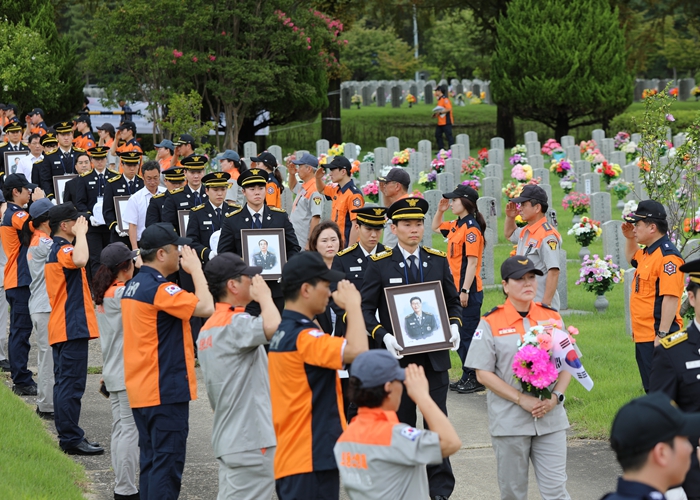 서울시 소방재난본부는 8월 26일 국립대전현충원(소방공무원 묘역)에서 순직 소방공무원 6位(위)에 대한 합동 안장식을 거행했다고 밝혔다. 이번 안장식은 지난 2023년과 2024년, 사망 시기와 관계없이 국립묘지 안장이 가능하게 되고 안장 자격도 ‘위험직무순직자’에서 ‘일반순직자’까지 확대되게끔 `국립묘지법 시행령`이 개정됨에 따라 이뤄지게 됐다. 이에 서울소방재난본부에서는 올해 국립묘지 안장 예정인 순직 소방공무원 총 23명 중 유가족과 협의된 6명을 먼저 국립대전현충원에 안장했으며, 나머지 17명에 대해서도 연말까지 국립서울현충원에 안장될 수 있도록 차질 없이 준비를 이어갈 방침이다. 이날 행사에는 유가족을 비롯해 소방청, 의용소방대, 재향소방동우회, 순직소방공무원추모기념회 등 200여 명이 참석한 가운데 ▲헌화 및 분향 ▲추모사 ▲합동 안장 순으로 엄숙하게 진행됐다. 서울소방재난본부 권혁민 본부장은 추모사에서 “국민 안전을 위해 사명을 다하다 순직하신 선배님들께 깊은 경의를 표하며, 유가족분께도 진심 어린 위로의 말씀을 드린다”며 “순직 소방공무원의 헌신이 사회 전반에서 존중받을 수 있도록 예우를 강화하고 추모 문화를 확산해 나가는 데 힘쓸 것”이라고 말했다. 한편 서울시는 지난 2023년 제정한 `서울특별시 순직·공상 소방공무원 지원 조례`에 따라 순직 소방공무원 자녀 장학금, 유가족 건강검진 등 유가족 예우 지원을 이어 나갈 뿐 아니라 순직 소방공무원 및 유가족에 대한 추모·예우 정책도 더욱 강화할 계획이다. 지난 2001년 홍제동 주택 화재 사고 때 순직한 소방공무원 6명의 희생을 기리기 위해 지난해 홍제동 일원에 ‘소방영웅길’을 조성, 명예 도로로 지정했으며 매년 추모행사·시민 답사 프로그램을 진행하는 등 고귀한 희생정신을 기리고 그 숭고한 뜻을 함께 새길 수 있는 자리를 마련할 예정이다. 권 본부장은 “순직 소방공무원의 희생은 국가, 시민 모두가 함께 기억하고 감사해야 할 숭고한 가치”라며 “앞으로 유가족을 위한 제도적 지원을 더욱 강화하고, 소방 영웅의 정신을 길이 계승하기 위해 최선을 다해 나갈 것”이라고 전했다.