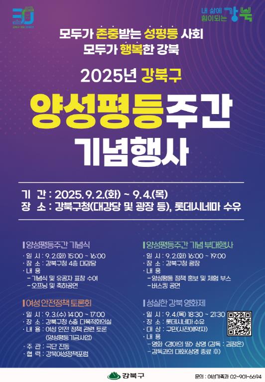 서울 강북구는 양성평등주간(9월 1일~7일)을 맞아 오는 9월 2일부터 9월 4일까지 3일간 강북구청 일대에서 ‘2025년 강북구 양성평등주간 기념행사’를 개최한다.이번 행사는 양성평등 실현에 기여한 유공자를 격려하고, 구민과 함께하는 다채로운 프로그램을 통해 성평등 인식을 넓히기 위해 마련됐다.기념식은 9월 2일 오후 3시 강북구청 대강당에서 열린다. 이날 기념식에서는 양성평등 문화 확산과 여성 사회참여 확대에 기여한 유공자에게 구청장 표창이 수여된다. 이어 구립시니어합창단의 오프닝 공연과 지역예술인의 축하 공연, 전 참석자가 함께하는 양성평등주간 기념 퍼포먼스가 펼쳐질 예정이다.같은 날 기념식 종료 후 오후 4시부터 7시까지는 구청 광장에서 주민 누구나 자유롭게 참여할 수 있는 부대행사가 진행된다. 지역예술인의 버스킹 공연과 함께 여성친화도시 구민참여단, 강북구여성연합회, 관내 여성단체 및 유관기관 등이 참여하는 여성정책 관련 홍보·체험 부스가 운영된다.9월 3일 오후 2시에는 강북구청 다목적회의실에서 ‘강북 여성안전정책 토론회’가 열린다. 양성평등기금사업의 일환으로 진행되는 이번 토론회에서는 여성 안전 실태와 정책 개선 방향을 논의할 계획이다. 참여를 원하는 구민은 별도의 신청 없이 방문하면 된다.9월 4일에는 롯데시네마 수유에서 ‘성실한(성평등 실현을 위한 한걸음) 강북영화제’가 개최된다. 사전 신청자를 대상으로 디지털 성범죄 피해자의 현실을 그린 영화 ‘경아의 딸‘을 상영한 뒤, 김정은 감독과의 대화를 통해 성평등 가치 확산을 모색한다.이순희 강북구청장은 “양성평등주간을 맞아 마련한 이번 행사가 우리 사회에 양성평등 가치를 확산시키고 구민 모두가 함께하는 계기가 되기를 바란다”며 “앞으로도 성평등한 지역사회를 만들기 위해 최선을 다하겠다”고 말했다.