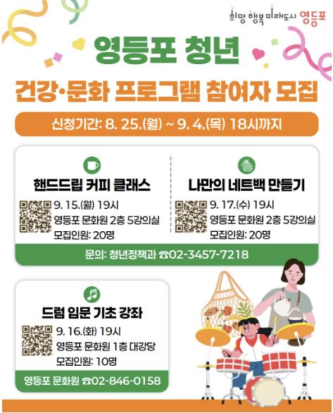 영등포구가 청년의 날을 맞아 다양한 취미 특강 프로그램을 운영한다고 밝혔다.이번 특강은 청년들이 여가를 즐기고 새로운 경험을 쌓을 수 있도록 ‘청년 주간 프로그램’으로 기획됐다.강의 주제는 ▲커피 클래스 ▲드럼 기초 ▲네트백 만들기 3가지다. 전문 강사와 함께 진행되며, 초보자도 부담 없이 쉽게 배울 수 있도록 구성했다.9월 15일 ‘핸드드립 커피 클래스’ 강의를 시작으로, 16일 ‘드럼 입문 기초 강좌’, 17일 ‘네트백 만들기 강좌’를 진행한다. 모두 영등포문화원에서 오후 7시부터 2시간 동안 운영한다.신청 대상은 영등포구에 거주하거나 생활하는 19~39세 청년으로, 참가비는 무료다. 모집 인원은 커피 클래스와 네트백 만들기 각 20명, 드럼 기초 강좌 10명이다. 신청은 9월 4일까지 포스터에 안내된 큐알(QR)코드를 통해 가능하며, 전산 추첨 후 9월 5일 문자로 결과를 개별 통보한다.구는 청년의 건강한 삶과 문화 감수성 향상을 위해 ▲클라이밍 특강 ▲요리 강좌 ▲힐링 영화 감상 ▲와인 클래스 ▲퍼스널 컬러 진단 ▲청년 반찬 모임 ▲미혼 청년 소셜만남 등 다양한 프로그램을 운영해 왔다. 앞으로도 사진 촬영, 다도 체험 등 특별한 프로그램을 이어갈 계획이다.최호권 영등포구청장은 “이번 특강이 바쁜 일상에 지친 청년들에게 활력을 불어넣는 계기가 되길 바란다”라며 “앞으로도 청년들이 삶의 여유를 즐기고 다양한 경험을 쌓을 수 있도록 지원하겠다”라고 전했다.
