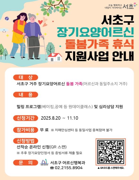 서울 서초구는 오는 9월부터 11월까지 장기요양어르신을 돌보는 가족의 스트레스 해소와 재충전의 기회를 제공하기 위해 `장기요양어르신 돌봄가족 힐링 프로그램`을 운영한다고 밝혔다.‘장기요양어르신 돌봄가족 힐링 프로그램’은 돌봄가족의 정서적 회복을 지원하는 `장기요양보호어르신 돌봄가족 휴식지원사업`의 일환으로 마련됐다. 앞서 구는 지난해 9월 `서초구 장기요양보호 대상자 가족지원 조례`를 제정한 이후, 올해 본격적인 시범사업을 운영 중이다. 지난 6월에는 경기도 광주 화담숲에서 돌봄가족 23명을 대상으로 ‘힐링 나들이’ 프로그램을 진행해 큰 호응을 얻은 바 있다.이번 프로그램은 오는 9월 5일부터 11월까지 주 1회씩 총 10회에 걸쳐 운영되며 회당 10명씩 총 100명을 대상으로 진행할 예정이다. 장기요양어르신과 주거 또는 생계를 함께하며 돌봄을 수행하는 가족이면 누구나 무료로 참여할 수 있다.프로그램은 9월 복숭아 보틀케이크, 망고무스케이크, 레몬아이싱 마들렌 등 베이킹 클래스를 시작으로 10월에는 꽃바구니, 미니 테라리움, 다육화분 만들기 등 원예 활동이 진행되며 11월에는 도마 만들기 등의 공예 프로그램까지 다양한 체험 중심의 커리큘럼으로 구성됐다. 이를 통해 돌봄가족 간 정보 교류와 공감대 형성의 기회를 제공하고, 스트레스와 우울감 해소, 심리적 안정 등의 긍정적인 효과가 기대된다.전성수 서초구청장은 “돌봄 스트레스로 지친 가족들의 일상 회복과 치유를 위한 의미있는 시간이 되길 바란다”며, “앞으로도 돌봄 부담을 덜어드릴 수 있는 실질적인 지원을 지속적으로 추진해 나가겠다”고 전했다.