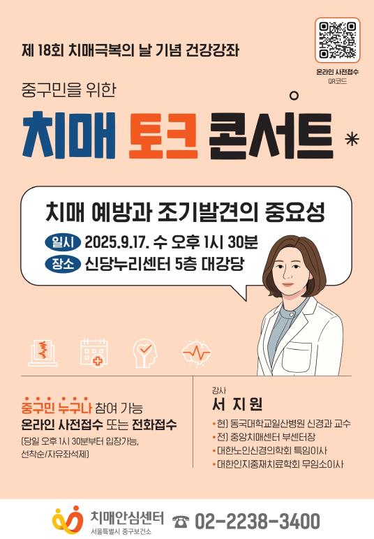 서울 중구가 제18회 치매극복의 날(9월 21일)을 맞이하여 오는 17일 신당누리센터 5층 대강당에서 주민 200여 명을 대상으로 치매 관련 토크콘서트를 마련했다.퇴행성 뇌 질환인 치매는 한국인이 가장 두려워하는 질환 중 하나다. 통계에 따르면 올해 치매 환자는 97만 명에 이르며, 65세 이상 고령자 10명 중 1명이 치매를 앓고 있는 것으로 나타났다. 이에 중구는 신경과 전문의의 건강강좌를 통해 치매에 대한 막연한 두려움과 부정적 인식을 극복하고 예방하는 방법을 공유할 예정이다.토크콘서트는 중앙치매센터 부센터장을 역임한 동국대 일산병원 서지원 교수가 진행한다. 치매 예방과 조기 진단의 기대효과, 경도 인지장애와 치매의 차이 등에 대한 설명을 듣고, 질의응답을 통해 치매에 관해 궁금했던 내용을 알아볼 수 있다.중구는 약 12만 명의 주민 중 60세 이상이 3만 6천 명으로 30%를 차지하고 있다. 이에 중구치매안심센터는 선별검사, 정밀검사 및 다양한 예방 프로그램, 인식개선 교육 등을 제공하고 있다.만 60세 이상의 어르신은 2년마다 필수적으로 검진을 해야 하며, 연 1회 무료로 기억력 검사를 받을 수 있다. 예약과 문의는 중구치매안심센터로 하면 된다.구 관계자는 “이번 토크콘서트를 통해 주민들이 치매에 대한 올바른 정보를 얻고, 두려움 대신 예방과 공감으로 함께 극복해 나가길 바란다”며 “치매 어르신과 돌봄 가족에게도 든든한 중구가 되겠다”고 전했다.