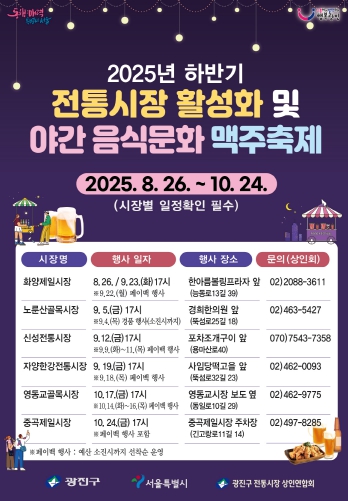 광진구가 전통시장에 활기를 불어넣기 위해 오는 10월까지 ‘2025 전통시장 축제 및 야간·음식문화 활성화 맥주축제’를 개최한다. 시장별 특성과 주민 수요를 반영한 먹거리와 문화행사로 구성된 축제는 서울시 공모사업에 선정된 시장을 비롯한 관내 전통시장 6곳에서 열린다. 지난 8월 26일 화양제일시장의 ‘화양연화 맥주축제’를 시작으로 하반기 일정이 펼쳐질 예정이다. 이달 4일부터 ▲노룬산시장 ‘예술이야-시장에서 먹고 놀자’ ▲신성전통시장 ‘아차산의 맛있는 밤’ ▲자양한강시장 ‘쉬엄쉬엄 야시장 맥주축제’ ▲화양제일시장 ‘건대상권 음식문화 맛있SHOW 대축제’ 등 다채로운 행사가 연달아 열린다. 이어 10월에는 ▲영동교시장 ‘가을빛 맥주축제’, ▲중곡제일시장 ‘문화 나이트 스퀘어’가 이어진다. 각 축제에는 맥주 및 먹거리 부스를 비롯해 지역 예술인 공연, 거리 공연 등 문화프로그램이 마련됐다. 소셜 네트워크 서비스(SNS) 인증사진 이벤트, 노래자랑 등 고객 참여형 콘텐츠도 준비돼 있다. 특히 쿠폰 제공 등 환급 행사와 즉석복권 지급, 경품 추첨 등 고객 감사 이벤트가 축제의 재미를 더한다. 행사는 상반기 축제 운영 결과와 간담회에서 수렴한 의견을 반영해 고비용 공연 위주의 방식에서 벗어나 주민자치회와 지역문화예술단체의 주체적인 참여로 만들어진다. 실질적인 고객 유입을 유도해 시장의 자립 기반을 강화하는 데 초점을 맞췄다. 김경호 광진구청장은 “전통시장이 소비의 공간을 넘어 지역 주민과 함께 소통하고 문화를 나누는 열린 공간으로 거듭날 수 있도록 적극적으로 지원하겠다”며, “이번 축제가 시장의 고유한 매력을 살리는 동시에 상인과 주민이 함께 만들어가는 지역 상권 회복의 계기가 되길 바란다”고 밝혔다.
