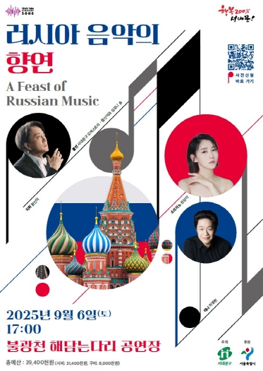 서대문구가 이달 6일 토요일 오후 5시 불광천 해담는다리 공연장에서 주민들과 함께하는 ‘러시아 음악의 향연 – A Feast of Russian Music’을 개최한다.자연 속에서 즐길 수 있는 도심 속 색다른 야외 음악회로 서울 서북권의 대표적 수변 명소에서 서울시 후원으로 펼쳐진다.이날 ‘서대문오케스트라 – 함신익과 심포니송’이 출연해 러시아 음악가인 쇼스타코비치의 ‘왈츠 제2번’, 림스키코르사코프의 ‘왕벌의 비행’, 차이콥스키의 ‘백조의 호수’ 중 ‘정경’, 보로딘의 ‘폴로베츠인의 춤’ 등을 연주한다.또한 소프라노 권상미와 테너 이명현이 우리 가곡 ‘가을의 노래’와 ‘잔향’을 비롯해 베르디의 오페라 ‘라 트라비아타’ 중 ‘불같이 타오르는 마음’과 ‘축배의 노래’, 구노의 오페라 ‘파우스트’ 중 ‘보석의 노래’를 들려준다. 함신익 지휘자가 해설을 통해 관객들의 곡 이해를 돕는다.이성헌 서대문구청장은 “불광천 해담는다리 공연장이 문화를 누리는 도심 속 수변 공간으로 발전하고 있다”며 “이번 공연이 열린 문화 쉼터이자 광장으로 더 많은 사랑을 받는 계기가 되길 기대한다”고 말했다.서대문구는 누구나 쉽게 클래식의 감동을 경험하고 일상 속에서 자연스럽게 문화예술을 느낄 수 있도록 2023년부터 ‘찾아가는 클래식 공연’을 지속해서 추진해 오고 있다.무료 공연으로 서대문구청 홈페이지(분야별정보→통합온라인신청→신속신청) 또는 전화(구청 문화체육과)로 신청하면 된다.