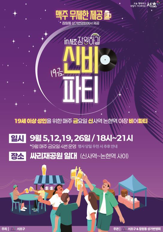 서울 서초구는 9월 매주 금요일, 잠원동 상권 ‘잠원하길’에서 ‘19금 신비파티(19세 이상 성인을 위한 매주 금요일, 신사역·논현역 비어파티)’를 개최한다.‘신비파티’는 신사역과 논현역 사이의 잠원하길 상권에서 방문객들이 1만원 이상 구매하면 1인 생맥주 무제한 이용을 제공하며, 노상 테이블에 앉아 음식과 맥주를 즐길 수 있는 행사다. 잠원동 일대 상권 활성화를 위해 지난해 처음 시작했고, 상권 활성화에 마중물이 되며 상인들의 큰 호응을 얻었다. 서초구가 주최하고 잠원동 상가번영회와 공동으로 주관하는 이번 행사는 9월 한 달간 매주 금요일마다 총 4회 열리며, 운영시간은 오후 6시부터 9시까지다.올해는 신비파티에서만 볼 수 있는 특색있는 LED 조명을 더욱 업그레이드해 이색적이고 신비로운 현장 분위기를 연출한다. LED로 장식한 테이블과 풍선, 신비파티 캐릭터인 3m ‘신비’ 인형 포토존 등이 방문객들의 이목을 끌 전망이다. 이와 함께 음악과 함께하는 DJ 파티, 맥주 빨리 마시기 대회, 잠원하길 퀴즈 맞히기 등 다채로운 참여 이벤트도 진행된다. 참여자에게는 잠원동 상권 70여 개 점포에서 사용할 수 있는 상권 할인쿠폰을 제공할 예정이다.상인들도 F·B 전문가 컨설팅을 받으며 적극적으로 나서고 있다. 이를 통해 다양한 축제 맞춤형 음식 메뉴를 개발하고, 행사 현장에서 판매하는 플리마켓 부스도 8개소 운영하는 등 방문객들에게 풍성한 볼거리와 먹을거리를 제공한다는 계획이다.한편, 이번 행사가 열리는 ’잠원하길‘은 구의 상권 브랜딩을 통해 탄생한 것으로, 다양한 맛과 즐거움이 연결되는 잠원동의 정체성을 강화한 이름이다. 특히, 1980년대 간장게장골목으로 유명했던 잠원동 상권에 젊은 세대가 유입되고 상권의 전성기가 영원하기를 바라는 소망을 담았다.전성수 서초구청장은 “9월 매주 금요일 밤, 잠원하길 신비파티에서 주민들은 일상 속 특별한 추억을 남기고, 상인들에게는 매출 확대의 기회가 되길 바란다”며, “앞으로도 ‘잠원하길’이라는 새로운 상권 브랜드가 대중들에게 깊이 각인되고, 상권에 활기가 돌 수 있도록 다방면에서 지원하겠다”고 말했다.