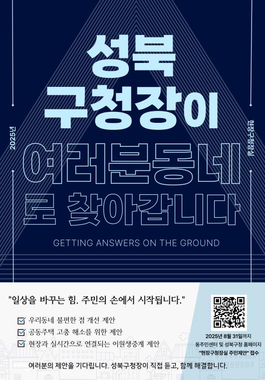 서울 성북구가 오는 9월 16일부터 11월 11일까지 총 20개 동에서 『2025년 하반기 1일 현장구청장실』을 운영한다고 밝혔다.현장구청장실은 “삶의 현장에 주민이 있고, 주민이 있는 현장에 답이 있다”는 이승로 구청장의 구정 철학이 담긴 대표 소통 사업이다. 주민이 구청을 찾아오는 것이 아니라 구청장이 직접 동 현장을 찾아 주민 의견을 듣고 해결 방안을 모색하는 방식으로, 2018년부터 이어져 온 성북구의 대표 현장 소통 모델이다.올해로 9회를 맞이한 현장구청장실은 그간 접수된 주민 제안과 해결 성과를 구청장이 직접 발표(PPT) 형식으로 주민과 공유할 예정이다. 제안 접수부터 해결 과정, 진행 중인 사안까지 구체적으로 설명해 구정 운영의 투명성과 신뢰도를 높이는 것이 특징이다.특히 이번 성과발표 구성은 더욱 창의적이고 주민 친화적인 현장구청장실을 만들기 위해 직원 아이디어 공모를 통해 마련된 것으로, 현장의 목소리를 보다 효과적으로 전달하고 주민 참여도를 높이는 계기가 될 전망이다.또한, 주민 참여를 강화하기 위해 주민이 직접 무대에 올라 구청장과 함께 제안을 설명하고 토론하는 방식으로 소통 무대를 운영한다. 이를 통해 주민과 눈높이를 맞추고 공감 중심의 현장 소통을 구현한다.아울러 현장의 생생함을 전달하기 위해 이원생중계 시스템을 도입, 리포터가 직접 현장을 연결하여 주민 제안의 배경과 상황을 실시간으로 소개함으로써 주민의 이해도를 높일 예정이다.이번 현장구청장실에서는 행정 서비스 접근성을 높이기 위해 보건소 대사증후군 검진, 마을행정사 상담, 건축·위생·지적 민원 상담 등을 동별 현장에서 함께 운영한다. 이에 따라 주민들은 구청을 직접 방문하지 않고도 자신이 거주하는 동에서 생활과 밀접한 행정 서비스를 보다 편리하게 이용할 수 있다.정책 홍보 방식도 한층 친근해진다. 성북구는 주요 구정 정책을 주민이 쉽게 이해할 수 있도록 ‘구청장과 함께하는 1:300 정책홍보 퀴즈’를 진행한다. 퀴즈를 풀며 정책 내용을 자연스럽게 익히는 방식으로, 단순 홍보를 넘어 재미와 학습을 결합한 주민 참여형 프로그램이 될 전망이다.이승로 성북구청장은 “주민들의 다양한 의견을 듣고 이를 정책에 반영하는 것이 가장 중요하다”라며, “특히 그동안의 현장구청장실 성과를 주민과 공유하고, 주민과 함께 무대에 올라 현장의 이야기를 나눌 수 있어 뜻깊게 생각한다. 앞으로도 『1일 현장구청장실』을 통해 주민과 더 가까이 소통하고, 실질적인 변화를 만들어 가겠다”고 말했다.이번 현장구청장실은 성북구청 유튜브 채널 ‘성북TV’를 통해 생중계된다. 관심 있는 주민은 누구나 접속해 시청할 수 있으며, 오픈채팅방을 통한 실시간 의견 참여도 가능하다.