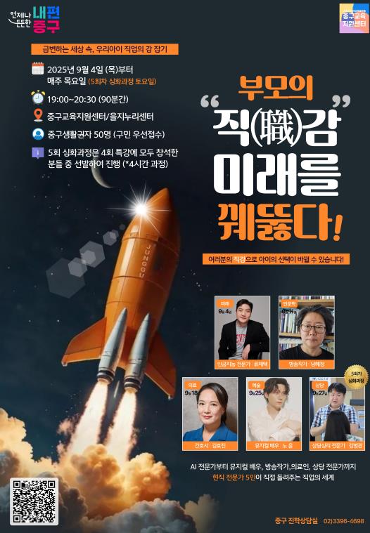 서울 중구가 급변하는 직업 흐름에 발맞춰 자녀의 진로 고민을 함께 나눌 수 있도록 `부모의 직(職)감, 미래를 꿰뚫다`를 주제로 부모특강을 개최한다. 특강은 중구교육지원센터가 주관하며, 오는 4일부터 25일까지, 저녁 7시부터 90분간 학부모 50명을 대상으로 네 차례에 걸쳐 진행된다.이번 특강에는 인공지능·방송·의료·예술 등 다채로운 분야의 전문가가 강단에 오른다. 강연은 자유로운 분위기 속 참여형 대화 중심으로 진행되며 진로 정보뿐만 아니라, 자녀와의 공감 대화법까지 체득할 수 있도록 준비했다.첫 강연은 9월 4일, 을지누리센터에서 열린다. `생성형 AI 전문가인 류제택 박사`가 인공지능 시대를 살아갈 아이들이 갖춰야 할 역량을 짚어줄 예정이다.이어 11일에는 `라디오 방송작가 출신 남혜정 씨`가 오랜 방송 현장에서 얻은 인문학적 시선으로 이 시대를 살아가는 부모의 태도에 대해 같이 고민하는 시간을, 18일에는 `연세대 임상실기교육센터 김효진 과장`이 간호사로서의 삶과 간호사 면허를 기반으로 직업의 폭을 넓혀가는 방법을 소개한다. 마지막으로 25일에는 뮤지컬 마타하리, 노트르담 드 파리, 베르사유의 장미 등 다양한 무대 위에서 활약해온 `뮤지컬 배우 노윤 씨`가 예술의 세계를 통해 진로의 또 다른 지평을 보여준다. 강연은 초등학교 5학년 이상 자녀와 동반 참석할 수 있으며, 강연 이후에는 질의응답 시간이 이어져 생생한 직업 현장의 궁금증을 해소할 수 있는 시간도 마련된다.특히, 네 번의 특강을 모두 수료한 중구민 학부모 중 30명을 선발해 오는 27일 오후 1시부터 5시까지 심화 프로그램 참여 기회도 제공한다. 지난해 부모 특강에서 큰 호응을 얻었던 TCI 기질 검사와 집단상담 프로그램으로‘마음봄연구소 김병관 상담심리전문가’가 맡아, 부모와 자녀의 기질과 성격을 분석해 준다. 이와함께 가족 모두가 활용할 수 있는 TCI 검사지도 제공하며, 분석 결과를 활용해 자녀와의 관계에 접목할 수 있는 방안도 제시한다. 더불어 대학생 봉사단이 자녀 돌봄 프로그램을 병행해 부모들이 상담에 온전히 집중할 수 있도록 지원한다.구 관계자는 “부모가 갈수록 다양해지는 직업의 세계를 이해하고, 자녀의 진로를 함께 고민하는 동반자로 성장할 수 있도록 이번 특강을 준비했다”며 “전문가와의 만남을 통해 부모가 진로에 대한 새로운 안목을 얻고, 자녀와의 대화 속에서 깊은 공감을 나누길 바란다”고 전했다.