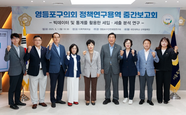 영등포구의회 의원연구단체 ‘영등포구 건전재정 연구회’가 1일 영등포구의회 다목적회의실에서 연구용역 중간보고회를 개최했다.이번 중간보고회에는 정선희 의장을 비롯해 유승용(대표의원)·우경란(간사)·차인영·남완현·이성수·이예찬·최봉희 의원 등 총 8명의 연구회 소속 의원들과 연구용역을 맡고 있는 국민대학교 산학협력단 관계자 등이 참석했다. 보고회는 ▲참석자 소개 ▲대표의원 개회사 ▲정선희 의장 축사 ▲기념촬영 ▲연구현황 보고 및 질의·응답 순으로 진행됐다. 유승용 대표의원은 ˝오늘은 연구용역의 진행 사항을 점검하고 그간의 성과를 공유하여 향후 연구 진행 방향 등을 논의하기 위한 시간˝이라며 ˝논의된 의견을 토대로 구 재정 운영의 합리성과 투명성을 높일 수 있는 실질적인 해법 마련에 최선을 다하겠다”고 말했다.정선희 의장은 ˝그동안의 성과를 함께 공유하고, 통찰력 있는 제안들로 우리 구 재정이 더욱 견고하고 투명하게 운영될 수 있기를 바란다˝며 ˝그간의 노력들이 의미있는 결실을 맺을 수 있도록 끝까지 최선을 다해 달라˝고 당부했다. 이어서 연구용역을 맡은 국민대학교 산학협력단 윤수찬 책임연구원이 재정분석, 재정지표 분석, 재정위험 요인 분석, 결론 및 시사점 순으로 연구 결과를 보고하고, 영등포구 세입 여건의 불안정성, 기금 규모 증가와 운용 효율성 부족, 문화·관광 분야의 낮은 예산 집행률 등을 주요 과제로 제시했다. 의원들은 세입 다변화 방안 마련, 기금의 효율적 관리, 집행률 제고를 위한 제도 개선의 필요성을 강조하며 질의·응답을 통해 활발한 논의를 펼쳤다.빅데이터 및 통계 자료를 활용하여 영등포구 세입·세출 구조 분석을 통해 구 재정의 합리적 운영을 위해 노력하고 있는 연구회는 하반기 중 최종보고회를 통해 정책 제언을 공식화할 예정이다.
