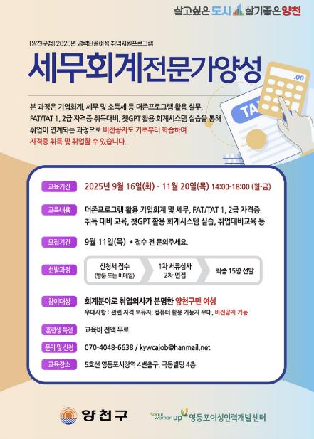 양천구는 경력단절여성의 실질적인 재취업을 지원하기 위해 실무 중심의 ‘세무회계 전문가 양성과정’을 개설하고, 오는 11일까지 수강생을 모집한다고 밝혔다.이번 교육과정은 양천구가 지난해 실시한 `경력단절여성 실태조사` 결과를 바탕으로 기획됐다. 조사결과에 따르면, 재취업을 원하는 경력단절 여성 중 91%가 ‘초대졸 이상’이고, 73%가 정규직 취업을 희망했다.이에 구는 고학력 경력단절 여성의 정규직 취업률을 높이기 위해 회계 관련 직종 취업 지원을 위한 전문가 과정을 신설했다.교육과정은 비전공자도 기초부터 학습할 수 있도록 구성했으며, ▲회계 입문자를 위한 기업회계 이론 ▲세무 및 소득세 등 더존프로그램 활용 실무 ▲FAT/TAT 1·2급 자격증 취득 대비 ▲챗GPT 활용 회계 시스템 실습 ▲취업 대비 면접 코칭 등이다.교육 수료 후에는 맞춤형 상담과 관련 기업과의 연계를 통해 재취업까지 이어질 수 있도록 지원할 예정이다.한편 양천구는 2023년부터 경력단절여성 취업지원 교육과정을 운영하고 있으며, 디지털드로잉 디자이너, 4차 산업혁명 미래교육 전문강사, 보험총무 사무원 양성과정 등을 진행해 수강생 73명 중 59명이 재취업에 성공했다.이기재 양천구청장은 “경력단절 여성은 취업 관련 정보 부족과 전문성 약화로 구직 기회를 놓치는 경우가 많다”며, “이번 교육과정이 재도약의 기회가 되길 바라며, 앞으로도 여성 구직자가 다시 사회의 일원으로 역량을 발휘할 수 있도록 실효성 있는 맞춤형 직업교육과 취업지원을 지속적으로 확대하겠다”고 말했다.