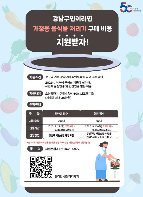 꿈이 모이는 도시, 미래를 그리는 강남구가 가정 내 음식물 쓰레기 감축과 주거환경 개선을 위해 ‘가정용 음식물류 폐기물 소형 감량기 구매 지원 사업’을 하반기에도 이어간다. 지원 신청은 9월 15일부터 선착순으로 진행한다.이 사업은 음식물 폐기물을 원천 감량하고, 고가의 감량기 구매에 따른 주민 부담을 덜기 위해 마련됐다. 2024년 기준 강남구 전체 음식물 쓰레기 배출량은 약 5만 5천 톤이며, 이 중 가정에서 배출된 양이 3만 640톤으로 전체의 55%에 달한다. 하지만 현재 이 폐기물을 처리할 공공 처리 시설을 더 이상 설치할 수 없는 상황이어서, 원천적인 감량 대책이 절실한 실정이다.이에 따라 지난 상반기부터 이 사업을 추진해 구민들에게 큰 호응을 얻었다. 당시 2,147명의 주민이 신청해 이 가운데 1,760명이 실제 지원을 받았다. 만족도 조사 결과, 응답자 가운데 97%가 사업에 만족한다고 답했으며, 92%는 음식물 쓰레기 배출량이 절반 이상 줄었다고 밝혔다.가정용 소형 감량기는 음식물 쓰레기를 건조 및 분쇄해 부피를 줄여주는 기기지만, 평균 70만 원에서 100만 원에 달하는 가격 탓에 구입을 망설이는 주민이 많았다. 이에 하반기에도 구민의 가계 부담을 덜고 생활 편의성과 위생 개선을 돕기 위해 지원을 이어간다.지원 대상은 공고일인 9월 1일 기준으로 강남구에 주민등록이 되어 있는 주민 중, 올해 안전인증과 품질인증을 받은 가정용 소형 감량기를 이미 구입했거나 구매 예정인 사람이다. 구매 금액의 50% 이내에서 최대 35만 원까지 지원되며, 가구당 1대만 신청할 수 있다.신청은 오는 9월 15일 오전 9시부터 강남구 자원순환 종합포털을 통해 온라인으로 접수할 수 있다. 온라인 이용이 어려운 만 65세 이상 고령자는 9월 15일 오후 2시부터 30일 오후 6시까지 구청 자원순환과를 방문해 신청할 수 있다. 온·오프라인 신청 모두 선착순 접수한다.조성명 강남구청장은 “이 사업은 음식물 쓰레기 문제 해결을 위한 대표 사례로, 주민 만족도가 높고 실질적인 감축 효과도 보이고 있다”며 “앞으로도 자원순환을 실천하면서 주민 편의를 높이는 정책을 지속 확대해 나가겠다”고 밝혔다.