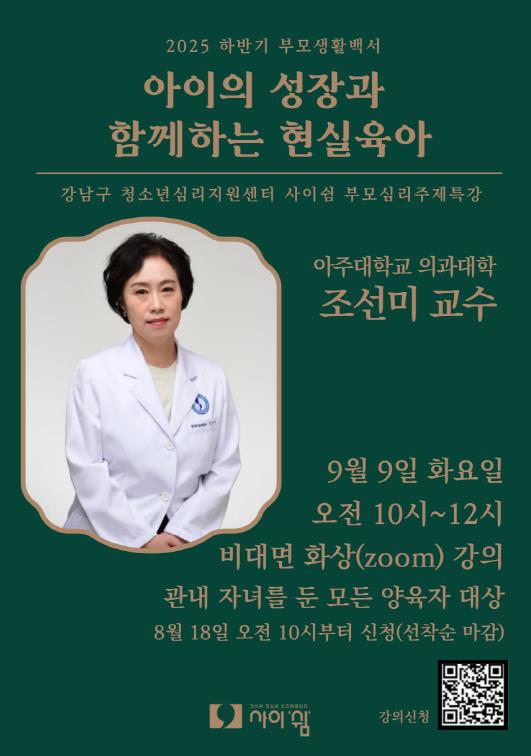 꿈이 모이는 도시, 미래를 그리는 강남구는 오는 9월 9일 오전 10시부터 12시까지 아동·청소년 자녀를 둔 부모를 대상으로 온라인 특강 ‘아이의 성장과 함께 하는 현실육아’를 개최한다.이번 특강은 강남구청소년심리지원센터의 부모 지원 프로그램 ‘부모생활백서’의 일환으로 마련됐다. 특히 맞벌이로 평일 낮 강의 참석이 어렵거나, 돌봄 문제로 외출이 힘든 부모들도 손쉽게 들을 수 있도록 온라인 생중계 방식으로 진행한다.강연은 아주대학교 의과대학 조선미 교수(임상심리전문가)가 맡는다. 조 교수는 30여 년간 아이와 부모를 대상으로 심리 평가와 상담, 부모 교육을 이어온 국내 최고 수준의 전문가로, 현실육아 분야에서 영향력 있는 멘토로 꼽힌다. 그는 아이가 성장하며 겪는 발달 단계별 변화를 어떻게 현명하게 받아들이고 대처해야 하는지, 부모들이 가장 궁금해하는 실제적인 양육 지침을 제시할 예정이다.또한, 1시간 가량 부모들의 질문을 받고 조 교수가 직접 답변하는 시간을 마련해, 부모들이 체감하는 현실적인 고민을 함께 나누고 해법을 모색할 계획이다. 청소년심리지원센터의 모든 프로그램과 강의는 무료로 운영되며, 참가를 원하는 구민은 센터 홈페이지(서비스신청`심리서비스`심리교육)에서 사전 신청할 수 있다.조성명 강남구청장은 “바쁜 일상 속에서도 부모가 자녀와의 관계에서 지혜와 공감을 얻을 수 있는 시간이 되길 바란다”며 “앞으로도 청소년 정신건강을 지키고 건강한 가정을 만들어가는 전문 프로그램을 지속적으로 운영하겠다”고 말했다.
