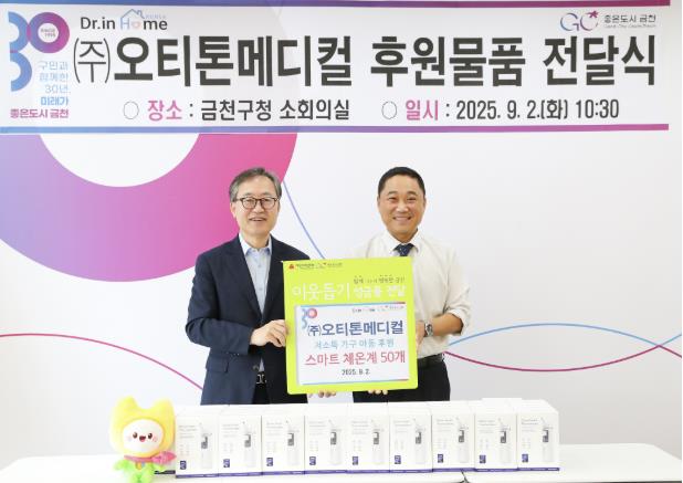 금천구는 지난 2일 ㈜오티톤메디컬이 금천구 저소득가구 아동을 위해 1천만원 상당 후원물품을 전달했다고 밝혔다.이번 후원 물품 전달식에서 ㈜오티톤메디컬은 ‘스마트 체온계’ 50개를 전달하며 따뜻한 나눔을 실천했다. 후원 물품은 각 동주민센터를 통해 저소득가구 아동에게 배부될 예정이다.‘스마트 체온계’는 체온 측정은 물론 귀 내부 촬영 기능까지 갖춰, 중이염이나 감기에 취약한 유·소아의 건강 상태를 가정에서 효과적으로 관리할 수 있도록 돕는다.김재영 ㈜오티톤메디컬 대표는 “지역사회와 함께 성장하는 기업으로서, 당사의 제품이 금천구 아동들의 건강한 성장에 도움이 되길 바란다”라고 전했다.유성훈 금천구청장은 “금천구 아동의 건강한 성장을 위한 따뜻한 나눔에 깊이 감사드린다”라며, “금천구는 기업의 성장이 지역사회 환원으로 이어지는 선순환이 계속될 수 있도록, 앞으로도 기업 지원에 힘쓸 것”이라고 감사의 뜻을 전했다.한편, 2022년 설립한 ㈜오티톤메디컬은 금천구 가산동에 소재한 가정용 의료기기 개발 기업으로, 올해 1월 미국 라스베가스에서 열린 세계 최대 규모의 소비자 가전 전시회‘CES 2025’에서 혁신상을 수상하며 기술력을 인정 받았다.