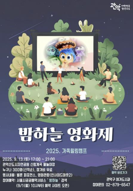 관악구가 오는 13일 ‘밤하늘 영화제’를 개최해 관악산 자연 속에서 가족, 친구들과 함께 힐링하는 여름밤 추억과 낭만을 선사할 예정이다.관악산공원 어린이 물놀이장(신림동 808-125)에서 진행되는 밤하늘 영화제를 위해 구는 약 2,800㎡ 부지의 어린이 물놀이장에 400인치 대형 스크린을 설치한다.이번에 상영되는 영화는 모든 연령층에게 큰 호응을 얻었던 ‘인사이드 아웃2’이다. 관람객들은 스크린 앞에 설치된 캠핑 의자와 에어 소파에 앉아 편안하게 영화를 감상할 수 있다.구는 영화 상영에 앞서 식전 공연으로 ‘벌룬 퍼포먼스’를 선보이고 솜사탕, 팝콘 등 간단한 먹거리를 제공해 영화관에 온 듯한 분위기를 더할 계획이다. 아울러 평소에 만나보기 어려운 관악산의 ‘야경’을 배경으로 한 포토존과 이색적인 조명을 더해 관람객들에게 더욱 풍성한 경험을 제공한다는 방침이다.구는 서울시 공공서비스예약 사이트를 통해 선착순으로 참여자를 모집한다. 9월 1일부터 5일까지 관악구민 우선 접수 기간을 운영하고 6일부터는 거주지역에 상관없이 모집, 영화제가 열리는 13일에는 현장 접수도 진행할 예정이다.박준희 구청장은 “관악산에서 등산이나 산책뿐만 아니라 자연과 함께하는 다양한 여가문화 콘텐츠를 통해 주민들에게 일상 속 휴식을 드리고 싶어 이번 영화제를 마련했다“라며 ”아름다운 관악산 야경이 있는 밤하늘 영화제에서 소중한 사람과 함께 즐거운 시간 보내시기를 바란다“라고 말했다.