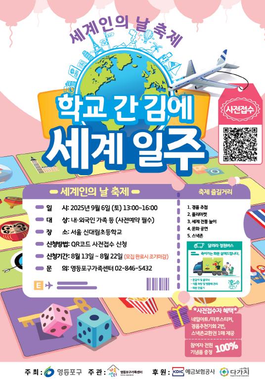 영등포구가 오는 9월 6일 ‘다문화축제’와 ‘청소년축제’를 개최해 세대와 문화를 잇는 소통의 장을 마련하고, 지역사회에 활기를 불어넣는다고 밝혔다.다문화축제는 이날 오후 1시부터 4시까지 신대림초등학교에서 열린다. ‘세계인의 날 축제 - 학교 간 김에 세계 일주’를 주제로, 외국인 주민과 지역 주민이 함께 어울려 서로의 문화를 이해하고 존중하는 건강한 지역 사회를 만들기 위해 기획됐다.행사장에는 ‘세계 나라별 체험부스’가 마련돼 12개국의 전통문화와 놀이를 직접 경험할 수 있다. ▲투호놀이 ▲세팍타크로(구기 스포츠) ▲구슬미로 ▲샤가이(몽골 전통놀이) ▲마라카스 만들기 등 다채로운 체험 프로그램이 운영된다.또 달려라 정원버스, 메이크업 체험, 차 나눔 부스, 플리마켓과 다드림문화복합센터 수강생들의 축하공연 등 다양한 부대행사도 마련돼 주민들에게 풍성한 즐길 거리를 제공한다.같은 날 오전 11시부터 오후 5시까지는 영등포동 시립 청소년미래진로센터(하자센터)에서는 청소년축제 ‘영스티벌’이 열린다. 이번 행사에는 관내 시·구립 청소년시설 9개소가 참여해 청소년들이 함께 즐기고 체험할 수 있는 다채로운 프로그램을 선보인다.센터 공간은 ▲포커스존 ▲퓨처스존 ▲뉴트로존 ▲플레이존 ▲마음건강존으로 꾸며지며, 방탈출게임, 쿠킹클래스, 포토존, 페이스페인팅, 부모와 자녀 소통 특강 등 청소년 눈높이에 맞춘 체험 활동이 운영된다.이번 축제와 관련한 자세한 사항은 구청 아동청소년과로 문의하면 된다.최호권 영등포구청장은 “이번 두 축제는 세대와 문화를 넘어 지역 주민 모두가 즐길 수 있는 소통의 장이 될 것”이라며 “앞으로도 구민이 함께 참여하고 공감할 수 있는 소통의 기회를 확대해 나가겠다”라고 전했다.