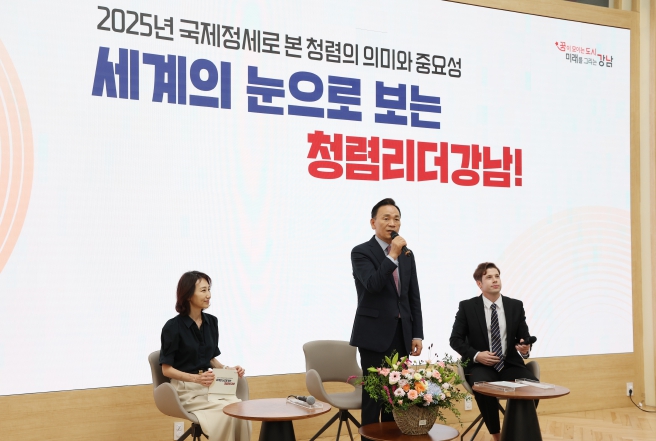 꿈이 모이는 도시, 미래를 그리는 강남구(구청장 조성명)가 9월 3일 구청 1층 로비에서 ‘세계의 눈으로 보는 청렴리더 강남!’을 개최했다. 이번 행사는 청렴 문화를 사회 전반에 확산하기 위한 참여형 프로그램으로, 구민과 공직자가 함께 청렴의 의미를 되새기고 실천 의지를 다지는 시간을 가졌다.이날 행사에는 정치학자 김지윤 박사와 방송인 크리스 존슨이 연사로 나서, 세계 각국의 청렴 제도와 시민의 역할, 청렴 강남의 국제적 위상 등을 주제로 대화를 나눴다. 두 연사는 글로벌 시각에서 바라본 청렴의 중요성을 쉽게 풀어내며 참가자들의 큰 호응을 얻었다.조성명 강남구청장은 “시민과 함께하는 청렴이야말로 진정한 투명 행정의 시작”이라며 “앞으로도 세계가 주목하는 책임 있는 도시로 나아가겠다”고 밝혔다.