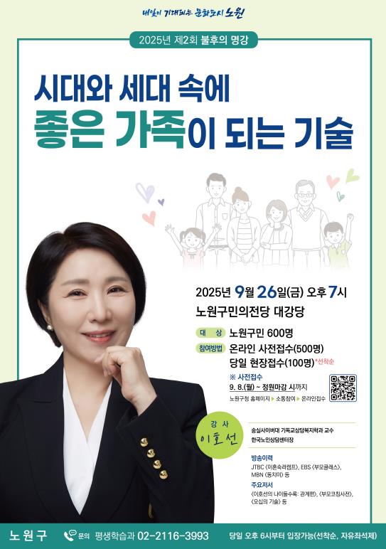 서울 노원구가 소통전문가 이호선 교수를 초청해 2025년 `제2회 불후의 명강`을 개최한다고 밝혔다.`불후의 명강`은 인문, 건강, 과학, 대중문화 등 다양한 분야의 명사를 초청해 시대적 문제와 개인의 삶에 대한 이야기를 나누는 구의 대표적 평생교육 사업이다. 올해는 지난 6월 미술사학자 양정무 교수가 불후의 명강 첫 강연을 맡았으며, 제2회 강연은 상담심리 전문가 이호선 교수가 이어간다.이호선 교수는 숭실사이버대학교 기독교상담복지학과 교수이자, EBS `달라졌어요`, KBS `아침마당`, SBS `길위의 닥터`, `좋은아침`, jtbc `이혼숙려캠프` 등 다양한 방송과 강연을 통해 대중과 활발히 소통해온 상담 전문가다. 『이호선의 나이들수록: 관계편』, 『오십의 기술』, 『부모코칭사전』 등 다수의 저서를 통해 노년기 삶과 가족관계에 대한 인문적 통찰을 전해왔다.오는 9월 26일 오후 7시, 노원구민의전당 대강당에서 진행되는 제2회 불후의 명강 주제는 `시대와 세대 속에 좋은 가족이 되는 기술`이다. 빠르게 변화하는 시대 속에서 가족 구성원 간의 갈등과 오해, 단절을 넘어 공감과 회복으로 나아가는 과정을 따뜻하고도 유쾌하게 풀어낼 예정이다.강연에 참여를 원하는 구민은 오는 9월 8일부터 노원구청 홈페이지를 통해 사전 접수하면 된다. 행사 당일 현장 접수도 가능하다. 온라인 접수는 500명, 현장 접수는 선착순 100명에 한해 입장할 수 있다. 좌석은 지정석 없이 자유좌석제다.한편, 불후의 명강은 지난 2019년 김미경 강사의 ‘나를 지독히 사랑하는법 인생美답’을 시작으로 가수 김창완, 소설가 조정래, 프로파일러 표창원, `나의 문화유산답사기` 저자 유홍준 교수, 뇌과학자 장동선 등 각계각층의 명사들을 강사로 초빙해 매회차 마다 주민들의 뜨거운 호응을 얻고 있다.오승록 노원구청장은 “세대와 관계의 변화 속에서 가족을 돌아보는 시간이 되기를 바란다”며 “앞으로도 불후의 명강을 통해 구민이 공감하고 함께 성장할 수 있는 배움의 장을 계속 열어가겠다”고 말했다.