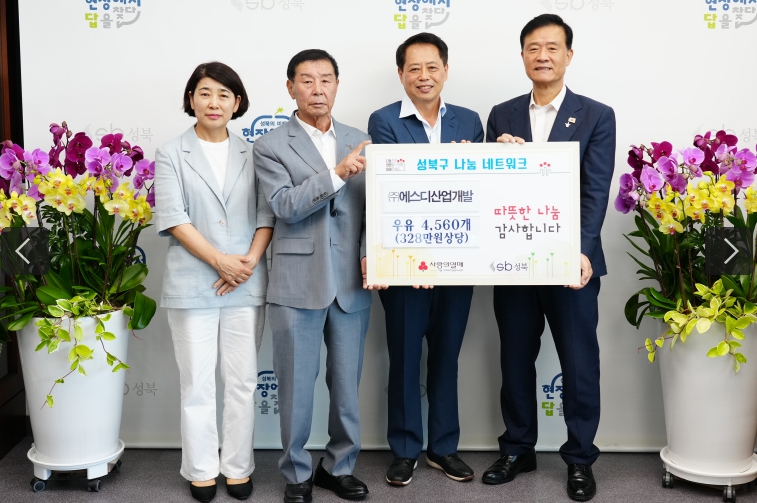 ㈜에스디산업개발(대표 전수호)가 어르신들의 건강한 여름나기를 위해 서울 성북구에 우유 190박스(4,560개)을 전달했다.3일 성북구청에서 진행된 전달식에는 이승로 성북구청장과 ㈜에스디산업개발 신화섭 이사 등 관계자가 참석했다. 기부된 성품은 무더위에 취약한 어르신들의 건강을 지키고 경로당 이용 활성화를 지원하기 위해 관내 경로당에 신속하게 배부됐다.이승로 성북구청장은 “이웃을 위해 따뜻한 나눔을 실천해 주신 ㈜에스디산업개발에 깊이 감사드린다”며 “성북구는 앞으로도 지역사회 나눔문화 확산과 어르신들의 복지 증진을 위해 최선을 다하겠다”고 밝혔다.성북구는 앞으로도 민간단체 및 기관과의 협력을 통해 취약계층 및 어르신 복지 지원과 나눔활동을 확대해 나갈 계획이다.