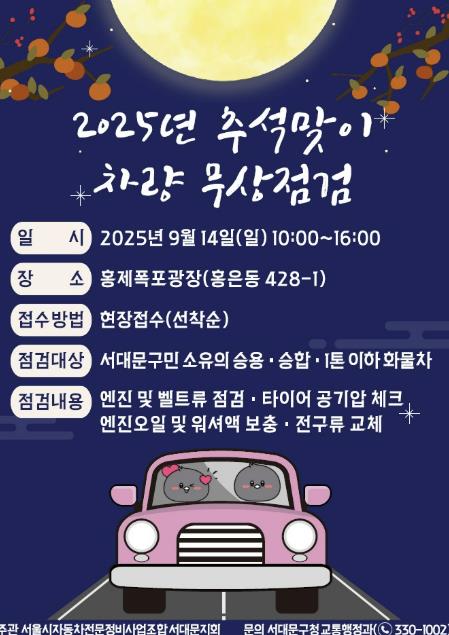 서대문구가 명절을 맞는 구민들의 안전한 차량 이용을 위해 ‘서울시 자동차전문정비사업조합 서대문지회’와 함께 ‘2025년 추석맞이 차량 무상점검’을 실시한다.대상은 구민 소유의 승용차, 승합차, 1톤 이하 화물차며 오늘 14일 일요일 오전 10시부터 오후 4시까지 홍제폭포광장(홍은동 428-1)에서 진행한다.이날 지회 소속 전문 정비사업자 40여 명이 참여해 핸들과 브레이크, 엔진, 배터리, 타이어, 등화장치, 벨트류 등을 점검한다.또한 엔진오일과 워셔액, 부동액 상태를 확인해 보충하고 필요시 전구류 교체 서비스도 제공한다.아울러 휘발유와 LPG 차량을 대상으로 배출가스 점검 서비스를 추가 실시한다.이성헌 구청장은 “장거리 운행에 대비해 차량에 이상은 없는지 무상으로 점검받고 힐링 명소인 서대문 홍제폭포도 즐기시면 좋을 것 같다”고 말했다.