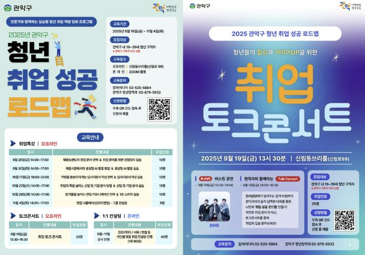 전국 최초의 청년친화도시 관악구가 급변하는 채용 환경 속 청년 구직자의 취업 실전 역량 강화를 지원하는 ‘2025 청년 취업 성공 로드맵’을 공개했다.9월 19일부터 11월 4일까지 운영하는 청년 취업 성공 로드맵은 ▲취업특강 ▲취업 토크콘서트 ▲1:1 온라인 컨설팅으로 구성됐다.5회에 걸쳐 진행되는 ‘취업특강’은 채용 동향, 기업 분석, 취업 준비 전략 등 이론교육과 함께 입사지원서 작성 등 실습을 매 회차 병행하는 커리큘럼으로 운영된다. 특강이 끝난 후에는 ‘모의 면접’을 실시하고 ‘그룹 컨설팅’을 진행해 피드백을 받는 시간도 마련했다.특히 구는 오는 20일 청년의 날에 열리는 청년축제의 사전행사로 9월 19일 ‘취업 토크콘서트’를 개최한다. 현직 인사담당자가 알려주는 합격 특강, 현직자 멘토와의 대화를 통해 청년들이 취업에 대한 솔직한 조언과 경험담을 듣고 취업과 직무에 대한 궁금증을 직접적으로 해소할 수 있는 기회를 제공할 예정이다.‘1:1 온라인 컨설팅’은 청년 취업 성공 로드맵이 운영되는 기간 내 상시 진행된다. 컨설팅은 40명을 대상으로 진행하고, 청년들은 개인당 1회의 컨설팅 서비스를 60분간 이용할 수 있다.관악구 청년 취업 성공 로드맵 오프라인 교육은 신림동쓰리룸(관악구 신림로 99), 1:1 컨설팅은 온라인 플랫폼(ZOOM)에서 각각 진행된다. 관악구 내 19세 이상 39세 이하의 청년 구직자라면 누구나 신청할 수 있고 관악구 거주자를 우선 선발할 예정이다. 참여를 희망하는 청년은 관악구청 홈페이지(참여/예약▷참여신청▷강좌/행사예약) 또는 QR코드를 통해 접수하면 된다.박준희 구청장은 “최근 청년 일자리 소멸이 가속화되어 많은 청년들이 높은 경쟁, 불안정한 고용 상황 속에서 취업에 큰 어려움을 겪고 있다”라며 “최신 채용 동향을 반영한 이번 취업 성공 로드맵을 통해 청년들이 원하는 일자리에 성공적으로 취업할 수 있기를 바란다”라고 말했다.