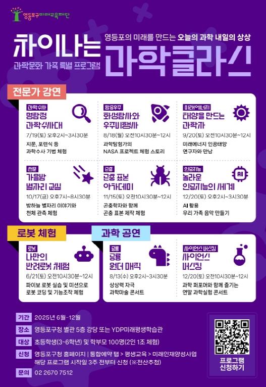 영등포구 산하 영등포구 미래교육재단이 ‘학부모 미래진로 콘서트’와 ‘차이나는 과학클라스’를 연중 운영한다고 밝혔다.학부모 대상 프로그램인 ‘학부모 미래진로 콘서트’는 급변하는 사회와 교육 환경 속에서 자녀의 진로를 효과적으로 지원할 수 있도록 기획됐다.오는 16일에는 바론디지털연구소 박점희 대표가 ‘인공지능 시대 리터러시 능력으로 미래 열기’를 주제로 디지털 도구 활용법 등을 강연하고, 25일에는 과학 커뮤니케이터 ‘엑소’ 이선호 대표가 ‘과학적 인생 설계를 통한 학습동기 완전정복’을 주제로 자발적 학습 방법 등을 소개한다.이어 10월~11월에는 ▲부모·자녀 소통 대화법(임영주 부모교육연구소 대표) ▲인공지능(AI) 시대 일자리 변화(반병현 ㈜나나컴퍼니 대표) ▲과학의 가치와 문화(김범준 성균관대학교 교수) ▲자녀 학교생활 로드맵(이은경 자녀교육전문가) 등 실생활에 적용 가능한 맞춤형 강연이 이어질 예정이다.한편, 재단은 초등학생(3~6학년)과 학부모가 함께하는 가족참여형 과학문화 프로그램 ‘차이나는 과학클라스’도 운영 중이다.특히 오는 20일에는 서울대학교 나용수 교수가 직접 참여해 ‘미래에너지와 인공태양’을 주제로 강연을 펼치고, 국가핵융합연구소와 함께하는 레고 만들기 체험도 진행된다. 10월부터는 ‘별자리 관측’, ‘곤충 표본 제작’, ‘인공지능으로 음악 만들기’, ‘과학실험 콘서트’ 등 매월 다채로운 주제를 선보인다.참여 신청은 영등포구 누리집(홈페이지) ‘통합예약-교육강좌’ 게시판 또는 홍보 포스터의 큐알(QR)코드를 통해 가능하다.영등포구 미래교육재단 관계자는 “자녀 진로 설계에 필요한 전문 지식을 얻고 생활 속에서 과학을 즐기는 기회가 될 것”이라며 “앞으로도 시대 흐름에 맞는 다양한 프로그램을 통해 구민 모두가 함께 성장할 수 있도록 지원하겠다”라고 전했다.