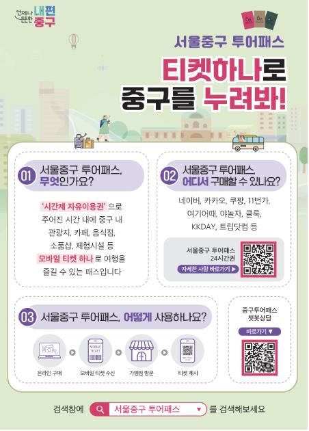 “남산 케이블카에 다양한 체험과 먹거리, 덕수궁까지 즐길 수 있어 만족스러워요” “별도 코스를 짤 필요 없이 패스되는 곳만 다녀도 알차네요” “숨은 골목골목까지 둘러볼 수 있어 너무 좋았습니다”서울 중구가 서울시 자치구 가운데 최초로 선보인 ‘서울 중구 투어패스’(이하 투어패스)가 높은 만족도와 뜨거운 호응을 얻는 가운데, ‘서울중구 전통시장상권발전소’와 손잡고 9월부터 11월까지 3개월간 전통시장 가을맞이 특별 이벤트를 마련했다.지난 3월 출시한 투어패스는 1년이 채 되지 않아 1,800매 이상 판매되며 올해 목표치(1천장)를 가뿐히 넘겼다. 이용객들은 “패스만으로 알찬 일정이 완성된다”,“가성비가 뛰어나다”, “남산과 명동 일대를 저렴하게 둘러볼 수 있었다”, “숨은 골목도 발견할 수 있었다”는 등 호평이 이어지고 있다. 구는 투어패스의 인기에 힘입어 중구 전통시장과 특별 가맹 이벤트를 열어 관광객들에게 ‘K-시장’의 매력을 알린다. 630여 년의 역사를 품은 중구의 전통시장 은 저마다 개성있는 전통을 자랑한다. 상권발전소는 시장별 대표 가맹점을 선정해 시장별 특색을 담은 혜택을 제공한다.이벤트는 9월‘신중부시장’에서 시작한다. 서울시 건어물 가게 최초로 ‘100년 가게’에 선정된 대유수산이 신중부시장 대표 가맹점으로 참여해 방문객에게 미역김자반과 바삭재래맛김 세트를 무료로 증정한다. 인스타그램 후기를 올리면 쥐포나 아귀포도 추가로 받을 수 있다.1957년 문을 연 신중부시장은 412개 점포가 밀집한 국내 최대 건어물 도매시장으로, 2013년에는 서울미래유산으로 지정되기도 했다.이어 10월에는 충무공 이순신 축제(10월 25일)에 들어설 전통시장 먹거리 부스에서 투어패스 소지자에게 특별 혜택을 제공하고, 11월에는 신중앙시장 대표 가맹점을 선정해 또 다른 이벤트가 진행될 예정이다.중구 투어패스는 일정 시간 동안 중구 내 주요 관광지·맛집·카페·전시·체험 시설에서 무료입장, 기념품 제공, 할인 등 혜택을 누릴 수 있는 모바일 티켓이다. 네이버, 쿠팡, 야놀자, 여기어때, KKday 등 주요 여행 플랫폼에서 손쉽게 구매할 수 있으며, 모바일 티켓은 카카오톡이나 문자 메시지로 전송돼 별도 앱 설치 없이 간편하게 사용할 수 있다.투어패스는 ‘기본권’과 ‘패키지권’ 두 종류로, 기본권(9,900원), 패키지권은 네이버 스마트스토어에서는 19,900원, 기타 온라인 플랫폼(야놀자, 쿠팡, 여기어때 등)에서는 21,900원에 판매된다.구 관계자는 “중구의 매력을 담아낸 투어패스가 전통시장과 연계해 관광객들에게 새로운 경험을 제공할 것”이라며 “명동과 남산을 방문하는 관광객의 발걸음을 중구 전통시장으로 넓혀 다채로운 추억을 새기고, 지역 상권에 활력을 더하길 바란다”고 말했다.