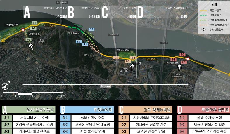강동구는 강동의 한강변을 주민의 일상과 연결되는 아름다운 수변 명소로 조성하기 위한 밑그림이 9월 내 완성된다고 10일 밝혔다.구는 지난해 10월 착수한 ‘한강변 친환경 정비 및 개발 타당성 조사 용역’을 통해 강동구 한강변의 다양한 가능성과 현황을 분석했으며, 각종 규제로 인해 한강변의 개발이 제한되는 상황에도 현행법 내에서 관계 기관과의 협의를 통해 추진 가능한 최적의 개발(안)을 마련했다. 이를 토대로 한강·산·숲이 어우러진 생태 축의 중심지로서 한강을 브랜드화하는 `강동 리버 그린웨이(Gangdong River Greenway)`라는 새로운 비전과 함께 ① 한강변 자연성 회복 및 보전, ② 지속가능한 지역 활성화, ③ 주민과 방문객 이용 만족도 증진, ④ 랜드마크화 및 브랜드화 등 세부 목표를 도출했다.구는 사업의 실효성과 효과가 극대화되도록 단기·중기·장기의 단계별 계획을 수립하고 제도 개선과 구간별 실행 사업을 병행 추진한다. 단기적으로는 관계 기관 협력과 현행 제도 내 가능한 사업부터 우선 추진하고, 중·장기적으로는 규제 완화를 통해 강동구 한강변을 문화예술이 어우러진 친환경 명소로 발전시키겠다는 계획이다.또한, 구는 암사생태공원에서 가래여울마을까지 4개 구간(A~D 구간)으로 나누어, 각 구간의 특성과 강점을 살린 전략으로 12개 실행 과제를 수립했다.먼저, 서울 암사동 유적, 암사역사공원, 암사초록길, 암사생태공원을 잇는 구간(A구간, ‘암사 초록 이음길’)은 역사와 생태가 공존하는 공간으로 조성할 계획이다. 역사·문화 체험과 생태 교육이 가능한 휴식 복합 공간을 마련하여 주민과 방문객 모두가 즐길 수 있는 역사 문화 해설 산책로를 구상하고 있다.특히, 암사취수장에서 고덕산까지 이어지는 구간(B구간, ‘한강누리길’)은 경관 특화 공간으로 조성한다. 한강변을 따라 걷는 생태관찰로를 조성하고 고덕산에는 고덕토평대교의 석양을 감상할 수 있는 전망대와 서울둘레길과 연계되는 생태교량을 조성하는 등 강동구 한강변을 랜드마크화하고 주민 생활과 한강을 자연스럽게 연결하는 계획을 구상하고 있다. 구는 이 구간이 한강유역환경청, 국방부, 아리수본부, 서울시 등 관계 기관 협의 및 사업 검토가 필요한 핵심 구간인 만큼, 보행자 안전 대책과 관리 방안을 마련해 지속 협의해 나갈 예정이다.이어지는 고덕산에서 고덕천까지(C구간, ‘고덕 생태누빔길‘)는 생태와 도시가 어우러진 공간으로 조성한다. 이 구간은 갈대숲이 우거진 고덕생태공원, 수변 감성 공간으로 재탄생한 고덕천까지 이어져 도심 속 힐링 공간으로 자리매김할 것으로 기대되는 곳이다. 구는 이 구간에 고덕토평대교 하부에 자전거쉼터 조성과 고덕생태공원 진입부 개선, 고덕천 연결성 강화 사업을 2026년부터 자체 추진할 계획이다.마지막으로 고덕천에서 가래여울마을까지(D구간, ‘여울마루 쉼터길’)는 자전거 라이더들의 쉼터로 사랑받는 공간으로, 이용객 편의시설을 확충하고 특화 먹거리길을 조성할 계획이다.구는 ‘강동 리버 그린웨이’가 단순한 친환경 공간 조성을 넘어 주민 여가·휴식 인프라 확충, 세대 간 교류 촉진, 교육·체험 기회 제공 등 다방면의 효과를 가져올 것으로 보고 있다. 관광·문화 콘텐츠 확장과 먹거리 산업 연계에 따른 지역경제 활성화 효과도 클 것으로 기대된다.이수희 강동구청장은 “한강변 친환경 정비 및 개발을 위한 타당성 조사가 마무리 단계에 접어든 만큼, 주민들이 체감할 수 있는 변화로 이어지도록 사업에 박차를 가할 것“이라며, ”‘강동 리버 그린웨이’로 강동의 한강변이 서울을 대표하는 친환경 수변공간으로 자리매김할 수 있도록 최선을 다하겠다”라고 말했다.