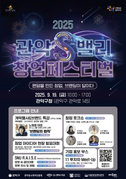 관악구가 오는 19일 ‘2025 관악S밸리 창업페스티벌’을 개최, 벤처기업과 투자자, 청년이 함께하는 아이디어와 기술 교류의 장을 연다.이번 행사는 관악구와 서울대학교, 서울창업센터관악이 공동 주최하고 서울대 캠퍼스타운 사업단과 올해 7월 출범한 관악중소벤처진흥원이 공동 주관한다.구는 올해 ‘팬덤을 만드는 창업, 브랜딩이 답이다’를 주제로 창업페스티벌을 개최한다. 기술력만으로 생존이 어려운 창업 환경 속에서, 고객 로열티와 연계한 ‘브랜드 전략’, ‘시장 확장’에 대한 통찰력을 제공한다는 방침이다.이날 행사는 구청사 내 4개 공간에서 동시 진행된다. 8층 대강당에서는 개막행사와 축하공연을 시작으로, 오전에는 CJ 브랜드전략 고문인 노희영 대표의 ‘브랜딩 특강’이 개최될 예정이다. 오후에는 ▲번개장터 ▲스파크플러스 ▲이벤터스 대표들이 경험담을 통해 실제 성장전략과 팬덤 마케팅 노하우를 전수하는 ‘창업 토크쇼’가 이어진다. 행사장 외부에서는 ‘1:1 투자자 Meet-Up’ 존을 조성해 VC 멘토와의 1:1 상담 기회도 선착순으로 제공한다.지하 1층 일자리 카페에서는 ‘창업 아이디어 현장 발표대회’가 열린다. 사전에 모집된 참가자 중 창의성과 사업성을 갖춘 최종 10명을 선정해 시상하고, 전문가와의 1:1 멘토링 기회도 행사 당일 제공할 계획이다.별관 7층 강당에서 열리는 ‘서울대학교 로봇·AI 경진대회’에서는 초등학생들이 직접 제작한 로봇을 선보인다. 본관 1층 로비에는 스타트업 홍보 부스와 로봇 체험존을 운영해 일반 주민들에게 다양한 창업 기업을 소개하고 콘텐츠 체험 기회를 제공한다.제6회 관악S밸리 창업페스티벌에는 예비 창업자, 청년 창업가, 투자자, 일반 시민 등 누구나 참가할 수 있다. 참가를 원하는 주민은 포스터 내 QR코드 또는 공식 홈페이지에서 참가 신청하면 된다. 참가비는 무료이고, 일부 프로그램은 당일 현장 접수도 진행한다. 한편 2019년 구의 창업 생태계 구축 사업의 일환으로 첫 문을 연 관악S밸리 창업페스티벌은 현재까지 누적 153개 스타트업과 7,400여 명의 창업가 등 주민이 참여하며 관악구 대표 ‘창업 축제’로 자리매김했다.박준희 구청장은 “창업 생태계는 이제 생존을 넘어 글로벌 팬덤과 브랜드 중심의 성장과 확장을 고민하는 시기에 와있다”라며, “이번 창업페스티벌을 통해 스타트업이 성장의 ‘핵심 공식’을 배우고 유니콘 기업으로 도약할 수 있는 기회를 갖기를 바란다”라고 말했다.