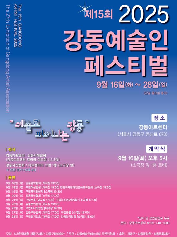 강동구가 오는 9월 16일부터 28일까지 강동아트센터에서 ‘제15회 강동예술인 페스티벌’을 개최한다고 12일 밝혔다.올해로 15번째를 맞은 강동예술인 페스티벌은 강동예술인총연합회가 주관하며, 지역 예술인과 주민이 함께하는 강동구의 대표적인 문화예술 축제이다.이번 축제는 ‘예술로 피어나는 강동’을 주제로 하여, 강동구에서 활동하는 다양한 분야의 예술인들에게 무대와 전시 기회를 제공해 창작 활동을 격려하고, 주민들에게는 수준 높은 공연과 다채로운 전시를 즐길 수 있는 장으로 마련된다.행사 공연에는 강동예술인총연합회 8개 단체, 강동구립예술단 7개 단체, 초청단체인 강동국제장애인문화교류협회가 참여한다.공연 일정은 ▲강동음악협회(16일, 대극장), ▲구립여성합창단(18일, 대극장), ▲강동국제장애인문화교류협회(18일, 소극장), ▲구립국악관현악(19일, 소극장), ▲강동국악협회(20일, 소극장), ▲구립무용(21일, 대극장), ▲구립청소년교향악단(21일, 소극장), ▲강동문인협회(23일, 대극장), ▲구립시니어합창단(25일, 대극장), ▲강동무용협회(27일, 대극장), ▲구립풍물(27일, 소극장), ▲구립경기민요(28일, 대극장), ▲강동연극협회(28일, 소극장) 순으로 진행된다.이와 함께, 축제 기간 중 강동아트센터 아트랑 전시장에서는 강동예술인총연합회에 소속된 미술‧서예‧사진협회의 작품 전시회도 개최된다.이수희 강동구청장은 “올해로 15회를 맞은 강동예술인 페스티벌은 강동이 가진 문화적 저력을 보여주는 대표적인 행사”라며 “앞으로도 지역 예술인의 창작 활동을 꾸준히 지원하고, 강동예술인 페스티벌을 주민과 함께하는 열린 축제로 더욱 발전시켜 나가겠다”고 말했다.