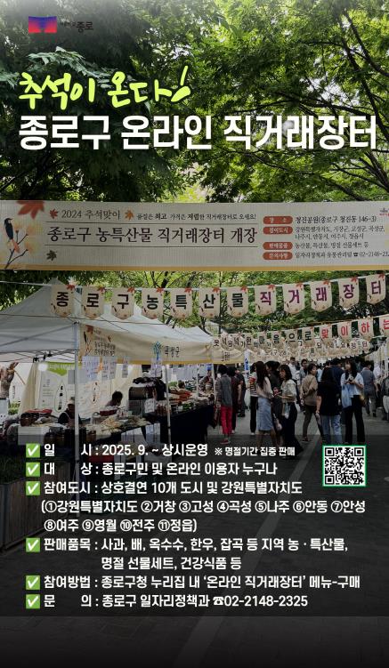 종로구는 민족 최대 명절 추석을 맞아 구민들의 명절 준비 부담을 덜고, 지역 소상공인들의 매출 증대를 지원하기 위해 ‘종로사랑상품권’을 발행하고 온라인 직거래 장터를 운영한다.종로사랑상품권은 구민들의 경제적 부담 완화를 위해 총 50억 원 규모로 발행한다. 서울페이플러스 애플리케이션(앱)에서 9월 16일 17시부터 구입 가능하다.할인율은 7%이며, 상품권은 종로구 내 2만 2,800여 개 가맹점에서 사용할 수 있다. 구매 한도는 1인당 월 50만원, 보유 한도는 총 150만원이고 유효기간은 구매일로부터 5년이다.온라인 직거래 장터는 9월부터 상시 운영한다. 구청 누리집을 통해 접속하면 된다. 구와 상호결연을 맺은 거창군, 고성군, 곡성군, 나주시, 안동시, 안성시, 여주시, 영월군, 전주시, 정읍시 그리고 강원특별자치도 총 11개 도시의 대표 농·특산물과 명절 선물 세트, 건강식품을 합리적인 가격으로 선보인다.아울러 구는 18일까지 ‘추석愛 나눔 기부 행사’를 진행한다. 명절이 더욱 외롭고 쓸쓸하게 느껴질 주변의 어려운 이웃에게 따뜻한 마음을 전하기 위해서다. 구민은 물론 관내 학교 재학생, 직장인 등의 참여로 이뤄진다. 지역사회가 함께하는 열린 캠페인이라는 점에서 의미가 크다.구청 본관과 각 동주민센터, 아파트 관리사무소 등 생활권 내 주요 거점에 ‘기부 나눔 박스’를 설치하고 식품 및 생필품 등 현물 기부를 받고 있다. 개인 또는 단체가 참여할 수 있는 성금 모금도 병행한다.정문헌 구청장은 “구민 여러분의 명절 준비에 실질적인 도움이 되고, 지역 상권에도 활기를 불어넣기 위해 ‘종로사랑상품권’ 발행, 온라인 직거래 장터 운영 등 다양한 지원책을 마련했다”라며 “주변의 이웃 누구도 소외되지 않는 따뜻한 추석을 만들기 위한 기부 캠페인도 함께 전개한다. 작은 정성이 모여 큰 울림이 되는 나눔 행사에 많은 관심을 부탁드린다”라고 밝혔다.
