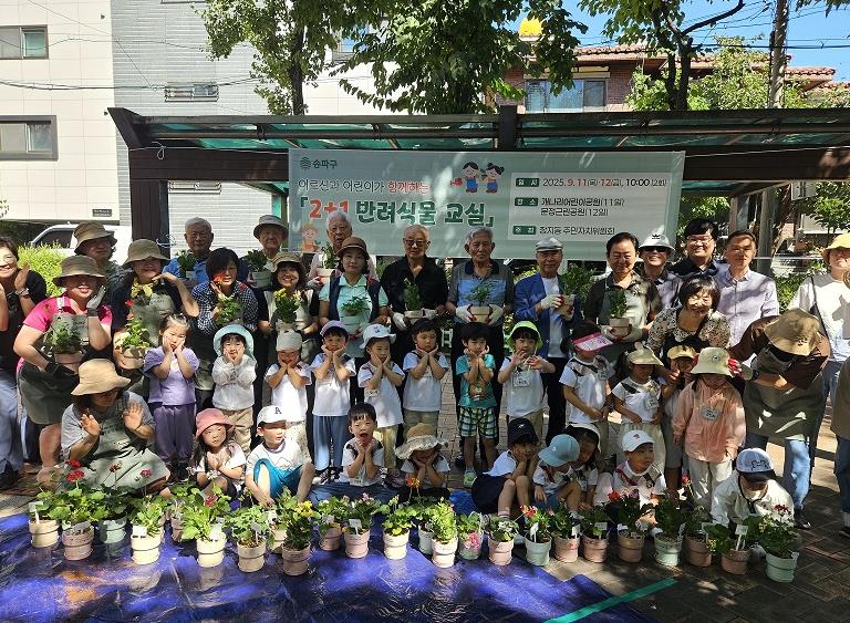서울 송파구 장지동은 지난 9월 11일과 12일, 세대 친화형 프로그램인 ‘2+1 반려식물 교실’을 성공적으로 개최했다고 밝혔다.이 프로그램은 지역사회 구성원 간 화합을 지원하고자 어르신과 어린이가 적극적으로 소통하며, 세대 공감을 강화하는 데 중점을 뒀다.‘2+1 반려식물 교실’은 ▲어르신과 어린이가 함께 반려식물 심는 방법을 배우고 화분을 만드는 ‘소통’ 활동과 ▲화분 하나(2+1)를 더 만들어 독거어르신 등 취약계층에 전달하는 ‘나눔’ 활동으로 구성했다.지난 11일에는 장지경로당과 버들어린이집, 12일에는 문정시영아파트 경로당과 힐스테이트아이편한세상어린이집이 참여해 어르신과 아이들이 함께 어우러져 식물 심기, 화분 꾸미기 등 활동을 하며 세대 간 장벽을 허무는 소통의 시간을 가졌다. 또, 송파구 마을정원사들이 봉사자로 참여해 어르신과 어린이들의 식물 가꾸기를 지원했다.참가자들은 마을정원사와 함께 실내 공기정화식물의 종류와 특성에 대해 알아보고, ‘제라늄’과 ‘칼랑코에’를 화분에 심고, 식물 가꾸는 방법을 배우는 등 실습을 진행했다.행사에 참여한 장지동 경로당 어르신들은 “오랜만에 어린 아이들을 보니 너무 귀엽고 동심으로 돌아가는 느낌이었다” “아이들과 함께 예쁜 꽃을 심으면서 저절로 웃게 되어 좋았다” 등 소감을 전했다.또한, 각자 화분 외에도 어르신과 어린이가 협동하여 반려식물 화분을 하나씩 더 만들었다. 추가로 만든 화분을 독거 어르신 등 취약계층에 전달하는 나눔을 통해 이웃 사랑을 실천했다.서강석 송파구청장은 “어르신들과 어린이들이 상호 소통하며, 세대 간 공감대를 확대할 수 있는 기회를 제공하고자 마련한 프로그램”이라며, “이런 경험을 통해 어린이들이 지역사회 구성원으로서 소속감과 자부심을 가지고 성장하기를 바란다.”고 전했다.