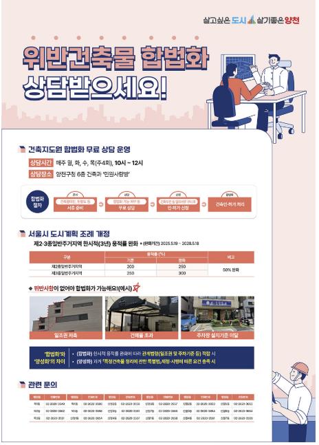양천구는 서울시 도시계획조례 개정으로 제2·3종 일반주거지역 용적률이 한시적으로 완화됨에 따라, 건축사가 참여하는 전문 상담센터를 운영해 위반건축물 합법화 절차를 지원한다고 16일 밝혔다.개정된 조례에 따르면 제2종 및 제3종 일반주거지역 내 건축물에 대한 용적률이 각각 200%에서 250%, 250%에서 300%로 상향 조정됐다. 2028년 5월 18일까지 3년간 한시적으로 적용되는 이번 제도를 통해 기존의 용적률을 초과한 일부 위반건축물도 일정 요건을 충족하면 합법화 절차를 밟을 수 있게 됐다.합법화 대상이 되는 건축물의 경우 건축주는 위반건축물 해제로 위반사항에 대한 이행강제금 부과 대상에서 제외될 수 있고, 세입자도 대출 제한 등 불이익에서 벗어날 수 있다.다만, 모든 위반건축물이 합법화 대상이 될 수 있는 것은 아니다. 과거 `특정건축물 정리에 관한 특별법`에 따른 양성화 개념이 아니라, 이번 한시적 용적률 완화에 따라 일정 요건을 충족하게 된 건물만 대상이 된다. ▲일조권 저촉 ▲건폐율 초과 ▲주차장 설치기준 미달 등 별도의 위반 사항이 있는 경우에는 합법화 대상에서 제외된다.구는 이번 제도 시행에 발맞춰 ‘위반건축물 합법화 상담센터’를 운영하고 무단 증축 등으로 불이익을 겪는 건축주들이 용적률 완화의 혜택을 받을 수 있도록 무료 상담을 지원한다.상담은 양천구건축사회 소속 건축사 등 전문가들이 맡아 해당 건축물 위반사항과 합법화 대상 여부, 절차 등을 일대일로 제공한다. 양천구청 6층 건축과 민원사랑방에 설치된 상담센터는 매주 월~목 오전 10시~12시까지 운영된다. 상담을 원하는 구민은 상담 시간에 맞춰 상담센터에 방문하면 된다.아울러 구는 지역 내 무단 증축 위반건축물을 대상으로 서류검토와 현장조사 등을 실시해 합법화 가능성이 있는 건축물을 선제적으로 발굴·지원한다는 계획이다.이기재 양천구청장은 “주민들이 제도에 대한 인식 부족으로 실질적 혜택을 받지 못하는 사례가 발생하지 않도록 상담센터를 운영한다”며 “이번 지원이 그동안 불편을 겪어온 주민들의 재산권 보호와 주거 안정에 도움이 되길 바란다”고 말했다.