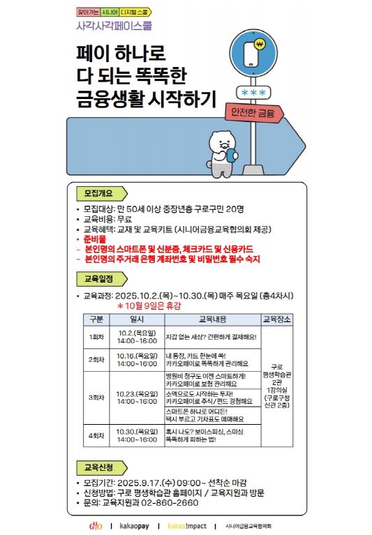 구로구가 오는 10월 구로평생학습관(구로구청 신관 2층)에서 중장년층 주민의 디지털 금융 역량 강화를 위한 ‘찾아가는 시니어 디지털스쿨’을 운영한다.구는 지난 4월 (사)시니어금융교육협의회 주관 ‘찾아가는 시니어 디지털스쿨’공모사업에 선정돼 시니어들의 디지털 금융 적응력과 활용도를 높일 수 있을 것으로 기대한다고 밝혔다.이번 교육은 만 50세 이상 구로구민 20명을 대상으로 10월 중 매주 목요일(2일, 16일, 23일, 30일) 오후 2시부터 4시까지 총 4회에 걸쳐 진행된다.강의에는 시니어금융교육협의회 소속 전문 강사가 나서 중장년층 눈높이에 맞는 △모바일 결제·송금 △모바일 자산관리 △병원비 간편 청구 △금융사기 예방법 등 생활 밀착형 디지털 금융교육을 제공한다.수강을 원하는 경우 오는 17일 오전 9시부터 구로평생학습관 누리집 또는 구로구청 교육지원과를 방문해 선착순으로 신청이 가능하다.참가자에게는 교재와 돋보기, 터치펜, 충전기 등이 포함된 교육 키트가 지급되며, 수강료는 전액 무료다.장인홍 구로구청장은 “디지털 환경에서 상대적으로 소외되기 쉬운 중장년층 주민분들이 금융 생활에서 불편을 해소할 수 있도록 이번 교육을 마련했다”며 “많은 주민분들이 관심을 가지고 참여해 디지털 금융 역량을 키우는 계기가 되길 바란다”고 전했다.
