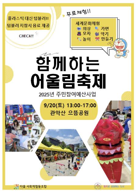 관악구는 다문화가족과 외국인 주민을 지역 사회 이웃으로 존중하고, 주민 간 상호 이해를 높이기 위해 문화적 다양성을 경험해 보는 특별한 축제의 장을 연다.이번에 개최되는 다문화 체험 축제는 2025년도 관악구 주민참여예산 공모를 통해 기획되어 9월 한 달간 총 2회 진행될 예정이다.오는 20일에는 관악산 으뜸공원에서 ‘함께하는 어울림 축제’가 열린다. 세계 각국의 전통의상을 입고 포토 존에서 기념사진을 촬영하거나, 나라별 전통 놀이와 공예 활동을 무료로 즐기며 서로의 문화를 체험하고 이해하는 축제의 장을 만든다는 방침이다. 축제에 텀블러를 들고 오면 세계 전통 음료를 시음해 보는 특별한 경험도 제공한다.27일에는 신림종합사회복지관(관악구 난곡로 110)에서 ‘We路(위로) 글로컬-데이’를 열고 지역주민들과 외국인 이웃을 맞이한다. 행사에는 각국의 전통의상부터 놀이, 음식, 언어문화 체험을 통해 문화와 인종을 넘어 서로에게 위로와 소통을 전하는 다양한 ‘We路(위로) 부스’가 운영된다.아울러 지역 내 글로벌 가족 지원기관들도 행사에 참여해 건강, 복지 등 유익한 정보를 제공할 예정이다.박준희 구청장은 “이번 행사를 통해 관악구의 모든 주민이 함께 즐거움을 나누고 서로를 이해하며 더욱 성숙한 글로벌 공동체로 나아갈 수 있기를 바란다”라고 말했다.