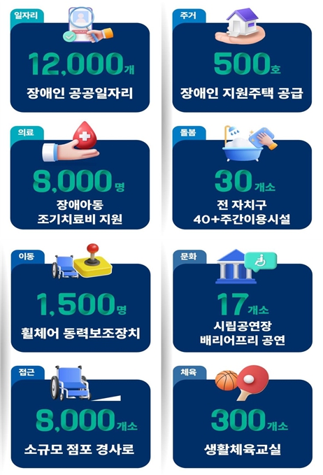 장애인들이 우리 사회의 구성원으로 ‘아주 보통의 하루’를 누릴 수 있도록 서울시가 종합적인 지원에 나선다. 일자리, 주거, 이동권, 인권의 4대 분야 지원으로 힘겨운 일상이 아닌 활력 넘치는 일상을 만들어가는 것이 주요 내용이다. 우선 장애인들의 경제적 자립과 안정적 생활을 지원하는 공공일자리를 연간 5,000개에서 12,000개로 대폭 늘리고, 공공일자리를 넘어 민간취업 사다리 역할을 할 직업훈련과정도 신설·강화한다. 장애인 중에서도 취업률이 특히 낮은 발달·뇌병변 장애인 맞춤형 직업학교도 ’30년 개교 목표로 추진해 나간다. 이외에도 걱정 없이 오래 거주할 수 있는 주거공간과 돌봄시설은 물론 AI와 로봇기술을 접목한 첨단보행 보조기기 보급, 승하차가 편한 대중교통 확대 등 단지 장애가 있다는 이유로 생활과 이동에 불편을 겪지 않도록 인프라도 갖춰나간다. 인권침해에 대해선 무관용 원칙을 적용, 든든하게 보호막이 되어준다. 서울시가 ‘장애인이 활력있는 일상을 누릴 수 있는 도시 실현’을 위한 5개년 종합계획을 16일 발표했다. 38만 5천여 명의 서울 거주 장애인에 대한 밀착지원으로 ‘아주 보통의 하루’를 완성하는 것이 주요 내용이다. 이번 계획에는 든든한 일자리와 소득, 편안한 주거와 돌봄, 자유로운 이동권과 접근권, 존중받는 인권과 여가 등 4대 분야, 12개 핵심과제를 담았다. 총 투입 예산은 2조 원이다. 준비 초기부터 서울시 장애인복지위원회를 비롯해 장애인 당사자들의 현장의 목소리를 충실히 담아 실효성을 높였다는 것이 특징이다. 현재 서울시 등록 장애인 수는 총 38만 5천 명. 장애인의 85%는 만성질환을 앓고 있으며, 74%는 가족 돌봄에 의존하고 있는 상황이다. 특히 15세 이상 인구 취업률은 63%인 반면, 장애인은 37%에 그쳐 사회참여율도 낮은 상황이다. 실제로 중증장애인 대상 조사 결과 응답자 45%가 가장 필요한 지원으로 ‘소득과 일자리’를 꼽았다. 장애인 일상 활력을 위한 첫 번째 계획은 장애인의 든든한 ‘일자리’ 제공과 안정적 ‘소득 보장’을 통한 경제적 자립과 내일 준비지원이다. 먼저 장애인 공공일자리를 현재 연간 5,000개 수준에서 2027년 7,000개, 2030년 1만 2,000개로 단계적으로 늘려 사회참여를 확대하고 이를 통해 스스로 미래를 설계할 수 있는 기회를 제공한다. 장애인 공공일자리는 공공기관·복지관 행정지원업무 등 ‘일반사무보조형’을 비롯해 요양보호사 보조‧어르신 안마서비스 등 ‘사회서비스형’, 바리스타·사서 등 ‘취업연계형’ 등이 있다. 시는 앞으로도 장애인의 가능성과 잠재력을 펼칠 수 있는 다양한 분야 일자리를 발굴하는 동시에 일시적 공공일자리를 넘어 일 경험을 통해 경력을 쌓아 지속 가능한 민간일자리에 취업할 수 있도록 든든한 사다리 역할을 할 계획이다. 배움을 넘어 안정적 경제활동을 통해 당당하게 자립할 수 있는 직업훈련 프로그램도 강화한다. 발달·뇌병변 등 중증 특화 ‘장애인 전문 직업학교’를 신설(2030년)하고, 현재 운영 중인 서울시 기술교육원에 ‘장애인 특화과정(목공, 바리스타, 제빵 등)’을 신설해 현장 수요형 직업인으로의 성장을 지원한다. 특히 ‘장애인 전문 직업학교’는 15세 이상 장애인을 대상으로 ICT 등 미래 유망산업에 대한 조기 직업교육과 기업수요형 직무 경험으로 자립기반을 지원하는 것이 핵심이다. 예컨대, 청각장애인 대상 ‘산업용 로봇 제어·운용’, 시각장애인 대상 ‘음향엔지니어’, 지체장애인 대상 ‘3D모델링 가상환경 설계’ 등의 과정들이다. 현재 운영 중인 ‘장애인 직업재활시설’ 30곳 역시 임가공 중심에서 코딩, 소프트웨어 작업 등 4차산업 업종으로 분야를 전환·운영 예정이다. 장애인들의 보다 여유로운 생활을 위한 ‘서울형 개인예산제’는 대상을 현재 100명에서 ’30년까지 2,600명(누적)으로 늘리고 지원예산도 현재 1인당 40만 원에서 50만 원으로 높인다. ‘서울형 개인예산제’는 대상자가 자기 개발, 취·창업, 주거환경 개선 등에서 직접 필요한 분야를 골라 사용할 수 있는 예산이다. 이외에도 저소득 중증장애인 생활 안정을 위한 ‘서울형 장애인 부가급여’를 현재 월 4만 원에서 2030년까지 월 8만 원으로 2배 인상해 3만 여 명에게 지급하고, 보이스피싱 등 금융 범죄 예방을 위한 금융역량 강화교육도 현재 매년 500명에서 2,000명으로 순차적으로 늘려나간다. 둘째, 익숙한 지역사회에서 걱정 없이 보통의 하루를 누리며 편안하게 생활할 수 있도록 맞춤형 ‘주거’와 촘촘한 ‘돌봄’도 제공한다. 우선 최대 20년간 마음 편하게 거주 가능한 ‘장애인 지원주택’을 현재 336가구에서 2030년까지 500가구로 확대한다. 주거공간은 물론 사회복지서비스, 지역사회 연계 등 주거지원서비스를 함께 제공하는 장애인지원주택은 입주 경쟁률이 평균 2.8대 1에 이를 정도로 인기가 높다. 저소득 재가 장애인 가정의 문턱 제거, 경사로 설치 등 가구당 최대 350만 원의 집수리 지원도 현재 1,700가구에서 4,000가구(’30년)로 늘린다. 3~4명 소수의 장애인이 집과 같은 환경에서 함께 살면서 돌봄서비스를 받을 수 있는 ‘공동생활가정’도 현재 150여 곳에서 250곳