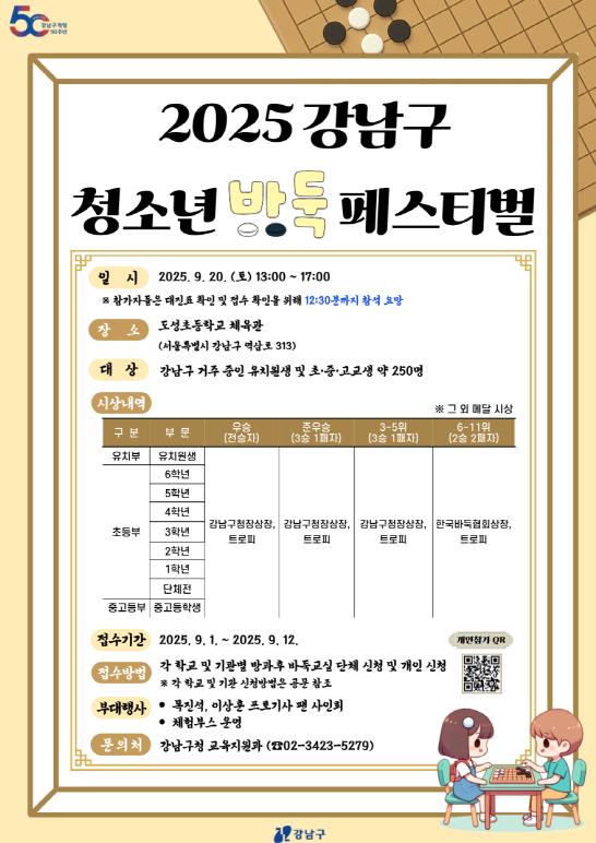 꿈이 모이는 도시, 미래를 그리는 강남구가 오는 9월 20일 오후 1시부터 5시까지 서울도성초등학교 체육관(역삼로 313)에서 ‘2025 청소년 바둑 페스티벌’을 개최한다.이번 행사는 청소년의 올바른 인성과 창의성을 겸비한 미래인재 양성을 목표로 강남구에서 처음 개최하는 바둑 축제다. 바둑은 집중력과 사고력, 인내심, 자기 통제력까지 함께 기를 수 있는 교육적 콘텐츠로, 대국을 통해 상대방에 대한 존중, 예절, 겸손을 배우는 인성교육으로도 각광받고 있다.특히 관내 30여 개 초등학교에서 방과 후 바둑 교실을 운영하고 있으며, 바둑이 교육적 효과가 크다는 학부모와 학생들의 높은 인식 속에 꾸준한 수요를 이어오고 있다. 이번 대회는 참가자 모집 단계부터 큰 호응을 얻으며 바둑에 대한 지역사회의 관심과 열기를 재확인하는 계기가 됐다.관내 유치원생부터 초·중·고등학생까지 총 250여 명이 참가할 예정이며, ▲유치부 개인전 ▲초등학교 학년별 개인전(1~6학년) ▲초등부 5인 단체전 ▲중고등부 개인전 등 총 9개 부문으로 나뉘어 진행된다. 각 부문별 상위 입상자에게는 상장과 트로피, 기념 메달이 수여된다.구는 경쟁보다 성장, 승패보다 배움에 초점을 맞춘 이번 행사를 통해 학생들에게 ‘사고력 있는 놀이’의 가치를 전하고자 한다. 이를 실현하기 위해 바둑 대회뿐 아니라 목진석 9단, 이상훈 9단 프로기사 팬 사인회, 페이스페인팅 체험부스 등 다양한 프로그램을 함께 운영해, 즐거움 속에서 배움이 이어지는 축제로 꾸밀 계획이다.조성명 강남구청장은 “이번 페스티벌은 강남구에서 처음 열리는 청소년 바둑 행사라는 점에서 더욱 뜻깊다”며 “높은 학구열 속에서 지친 청소년들이 스트레스를 해소하고 창의적 역량과 인격을 함께 키워나갈 수 있도록 앞으로도 다양한 문화·교육 프로그램을 적극 지원하겠다”고 밝혔다.