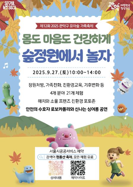 관악구가 오는 27일 오전 10시부터 오후 2시까지 청룡산 유아숲체험원에서 ‘2025년 제12회 유아숲 가족 축제’를 개최한다.유아숲체험원은 숲을 교실로 삼고 숲속 자연물을 매개로 다채로운 체험수업을 진행하는 유아 전용 숲 놀이터로 아이들이 자연 속에서 건강하게 자라고, 인성 및 신체 발달에 큰 영향을 미칠 수 있는 소중한 공간이다.구는 2012년 ‘청룡산 유아숲체험원’을 개장을 시작으로 현재까지 7개 유아숲 체험원을 운영, 서울시에서 가장 많은 유아숲체험원을 운영하고 있다. 올해들어 벌써 2,000회 운영했으며, 36,700명이 참여하며 큰 인기를 끌고 있다.이러한 인기에 힘입어 구는 아이들이 친구, 가족과 함께 자연 속에서 뛰놀며 즐거운 추억을 만들 수 있도록 가족 참여형 축제를 기획했다.이번 축제는 ‘몸도 마음도 건강하게 숲정원에서 놀자!’를 주제로, ▲정원처방 ▲가족친화 ▲친환경교육 ▲기후변화 4개 분야에서 총 21개의 다양한 체험 프로그램이 진행된다.특히, 관내 7개 유아숲체험원에서 활동 중인 숲지도사와 함께 ▲롤롤 마음풀기 ▲힐링 커뮤니티 댄스를 배우며 가족간의 소통과 공감 나누기 ▲정원 가족 명랑운동회 ▲마음풀기 볼링, 북극곰을 구하라! 등 아이들이 신나게 참여할 수 있는 숲 체험 활동도 풍성하게 마련된다.부대행사로는 서울시 대표 캐릭터 해치와 소울 프렌즈가 함께하는 친환경 포토존, 글로벌 인기 캐릭터 ‘안전의 수호자 로보카폴리와 신나는 싱어롱 공연’ 도 진행되어 아이들에게 특별한 즐거움을 선사할 계획이다.이번 축제는 유아를 동반한 가족 360팀을 선착순 모집하며, 모든 프로그램은 유료로 운영된다. 참여를 원하는 가족은 서울특별시 공공서비스 예약 사이트를 통해 사전 신청 후 참여할 수 있다.단, 행사는 우천 등 기상 상황과 현장 여건에 따라 변동될 수 있다. 주차는 청룡초등학교 운동장에 가능하고 행사장 내 휴식존도 함께 마련된다. 아울러, 어린이들의 안전을 위해 현장에는 구급차도 상시 대기할 예정이다.박준희 구청장은 “유아숲 가족축제는 아이들에게는 최고의 놀이터이자 자연 속 배움터”라며, “아이와 부모가 함께 교감하고 힐링하는 시간이 되길 바란다. 앞으로도 숲과 공원에서 즐길 수 있는 가족 힐링 여가 프로그램을 더욱 확대해 나가겠다”라고 말했다.