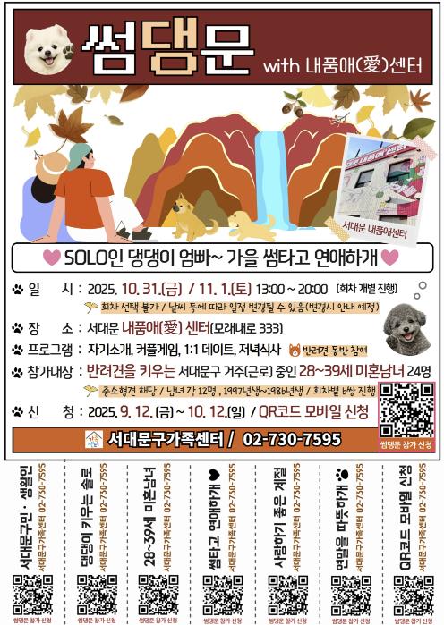 서대문구는 서대문구가족센터가 10월 31일과 11월 1일 서대문 내품애(愛)센터(모래내로 333)에서 반려견을 키우는 미혼남녀 만남 행사 ‘썸댕문 with 내품애센터’를 개최한다고 17일 밝혔다.올해 4월 커플 매칭률 65%를 달성하며 성황리에 종료된 ‘썸대문 with 벚꽃’의 두 번째 시리즈다.‘서대문 내품애센터’는 반려동물 복합문화공간으로 일부 장소를 이번 행사에 어울리게 꾸밀 예정이다.하루에 미혼남녀 12명씩 이틀간 24명이 오후 1∼8시 반려견과 함께 하는 레크리에이션 및 커플게임, 1:1데이트, 저녁식사 등에 참여한다.행사를 마칠 때 각각 마음에 드는 이성을 3순위까지 제출하며 최종 커플로 성사되면 후속 데이트도 지원받는다.서대문구에서 일하거나 거주하면서 반려견(중·소형견)을 키우는 28~39세 미혼남녀(1997~1986년생)가 참여할 수 있으며 희망자는 10월 12일까지 서대문구청 공지사항을 참고해 온라인(구글폼)으로 신청하면 된다.신청자들을 대상으로 거주지, 나이 등을 확인하기 위한 1차 서류 심사 후 무작위 추첨으로 참여자를 선정한다.선정된 이들은 주민등록초본, 재직증명서(직장인), 사업자등록증명원(사업자), 소득금액증명원이나 건강보험자격득실확인서(프리랜서), 혼인관계증명서(상세), 반려견 동물등록증 등을 내야 한다.이성헌 구청장은 “선선한 가을날 서대문구의 청춘남녀들이 반려견과 함께 이성을 만나며 즐거운 추억을 쌓고 소중한 인연도 만들 수 있길 기대한다”고 말했다.