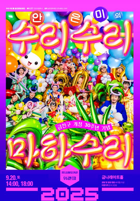 금천문화재단은 오는 9월 20일 금나래아트홀에서 특별 기획공연 ‘수리수리마하수리’를 선보인다고 밝혔다.이번 공연은 금천구 개청 30주년을 맞아 구와 구민, 그리고 관객의 행복을 기원하는 의미로 기획됐다.작품명인 ‘수리수리마하수리’라는 좋은 일이 있기를 바라는 간절한 마음을 담아 비는 주문에서 착안했다. 금천구의 지나온 30년을 돌아보고, 현재의 성취를 기뻐하며 밝은 미래를 향한 희망을 담아냈다.예술감독은 독창적인 작품세계로 주목받는 안무가 안은미가 맡았으며, 무용단 안은미컴퍼니(김혜경, 문용식, 김덕영, 한가온, 김세연, 이현서)가 함께한다. 또한 경기민요 소리꾼 이희문, 음악감독 넷 갈라(NET GALA)가 참여해 우리의 전통 소리와 몸짓을 현대적 감각으로 재창조할 예정이다.또한 한얼국악예술단과 지역 주민으로 구성된 금천구 춤 체조동아리 ‘어울림’이 무대에 함께 올라 전문 예술가와 지역 주민이 함께 어우러지는 특별한 무대를 선보인다.공연은 총 2회로, 9월 20일 오후 2시와 오후 6시에 진행된다. 만 48개월 이상이면 누구나 관람 가능하며, 전석 2만 원이다. 예매는 금천문화재단 누리집 또는 놀(NOL) 티켓에서 할 수 있다. 특히 개청 30주년을 기념해 1995년생의 금천구민에게는 50% 할인 혜택이 제공된다.서영철 금천문화재단 대표이사는 “이번 공연은 ‘함께 빌면 더 큰 기적이 일어난다’는 마음처럼 금천구민의 행복과 안녕을 기원하고자 마련했다”라며 “앞으로도 금천문화재단은 주민과 함께 호흡하며 일상의 삶을 풍요롭게 하는 문화예술을 이어갈 것”이라고 전했다.