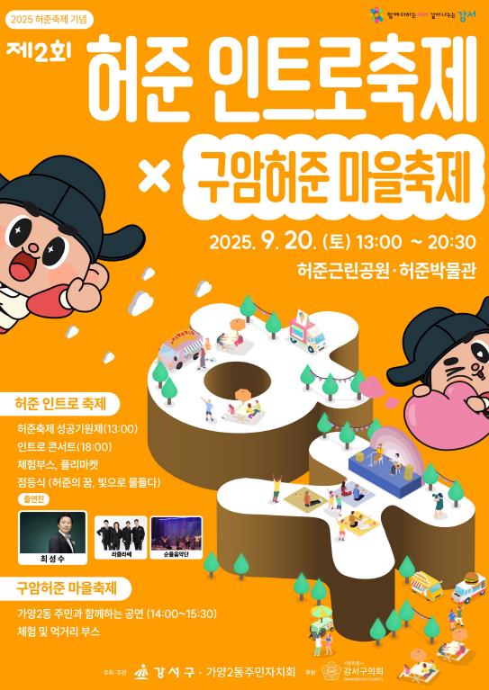 서울 강서구가 오는 20일 허준근린공원 일대에서 ‘제2회 허준인트로축제 × 구암허준마을축제’를 개최한다. 허준축제는 『동의보감』의 저자 허준 선생이 태어나고 저술 활동을 한 강서구의 대표 문화행사다. 구는 선생의 업적을 기리고, 10월 18일에 열릴 본 행사에 앞서 사전행사를 마련했다. 특히 올해는 가양2동 주민자치회와 협력해 주민이 직접 기획과 운영에 참여해 축제를 한층 풍성하게 준비했다. ‘건강과 치유’를 주제로 전통과 현대가 어우러진 다채로운 프로그램이 관람객들을 맞이한다. 행사는 공연, 점등식, 체험과 부대행사 등으로 구성된다. 축제는 오후 1시 ‘허준축제 성공기원제’로 문을 연다. 양천향교가 주관하며 허준근린공원 광장 허준 동상 앞에서 진행된다. 진교훈 구청장이 초헌관으로 참여해 주민의 안녕과 축제의 성공을 기원한다. 주무대에서는 오후 2시부터 가양2동 주민자치회와 지역 예술단체가 준비한 허준마을공연이 펼쳐진다. 사물놀이, 한국무용, 밴드 및 초대가수 공연 등 다채로운 공연과 축하무대로 꾸며진다. 오후 5시 30분에는 개막식이 열린다. 식전공연으로는 강서구립극단이 ‘동의보감’ 진서의 역사적 순간을 선보인다. 저녁 6시에는 ‘허준 인트로 콘서트’가 시작된다. 초대가수 최성수, 크로스오버 그룹 라클라쎄, 순율음악단이 출연해 세대를 아우르는 공연을 선사할 예정이다. 축제장 전역에서는 건강 검진, 한방차 시음, 약초꽃 손수건 만들기, 리사이클 공예, 타로, AI 그림 체험 등 10여 종의 체험 부스가 운영된다. 또한 ‘허준 혜민장터’에서는 다양한 먹거리와 플리마켓, 수공예품 부스가 마련돼 지역 소상공인과 주민이 함께 호흡하는 장이 될 전망이다. 축제의 대미는 오후 8시 30분 점등식으로 장식된다. ‘허준축제 빛의 서막’을 주제로 점등 퍼포먼스가 진행된다. 경관조명은 허준축제 본축제 시작 전인 10월 17일까지 허준근린공원 일대를 화려하게 밝힐 예정이다. 구는 이번 행사가 허준 선생의 의학 정신과 인간 사랑을 다양한 세대가 함께 나누는 계기가 되기를 기대하고 있다. 진교훈 강서구청장은 “‘허준 인트로축제’는 허준 선생의 역사적 가치와 지역 공동체 정신을 계승하는 소중한 자리”라며 “허준의 숨결이 살아 있는 강서에서 모두가 함께 웃고 즐기며 건강과 치유의 가치를 나누는 특별한 시간이 되길 바란다”고 말했다 한편, ‘제23회 허준축제’ 본행사는 오는 10월 18일과 19일 양일간 서울식물원과 마곡광장 일대에서 펼쳐질 예정이다.