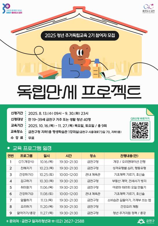 금천구는 청년들의 실질적인 주거 자립생활을 지원하는 교육 프로그램 ‘독립만세 프로젝트’ 2기 참여자를 30일까지 모집한다고 밝혔다.‘독립만세 프로젝트’는 전세사기, 역전세난 등 청년 주거 불안이 사회적 문제로 떠오른 상황에서 정보 부족으로 어려움을 겪는 청년들의 자립을 돕기 위해 마련됐다. 다양한 생활 맞춤형 교육과 커뮤니티 기반 프로그램을 제공하는 사업이다.10월 16일 오리엔테이션을 진행한 후 11월까지 평생학습관(금천구청 지하1층)에서 9차례에 걸쳐 운영된다.주요 교육 내용은 ▲부동산 계약 및 전세사기 방지 요령 ▲소비습관 길들이기 ▲건강요리 ▲성격별 행동유형 이해 ▲호신술 등 자기방어 교육 ▲구 청년 주거정책 소개 ▲취미활동 등이다.지난 6~7월 진행된 독립만세 프로젝트 1기 과정에서는 주거·생활 전반에 걸친 실질적 정보 제공과 골프, 호신술 등 체험 중심의 교육이 큰 호응을 받았다. 다만 청년들 간의 소통과 공감대 형성 등을 위한 네트워킹에 대한 수요가 컸다.이에 이번 2기는 커뮤니티 기반 학습 구조로 운영되는 것이 특징이다. 단발성 교육에 그치지 않고, 자취 중이거나 자취를 준비하는 청년들이 서로의 고민을 나누고 공감대를 형성할 수 있도록 도울 예정이다.구는 참여자 간 커뮤니티 활동을 강화해 주거 독립 역량 제고에 중점을 둘 것이라고 설명했다. 이를 통해 자연스럽게 형성된 청년 네트워크는 지역사회 청년활동 활성화에도 기여할 것이라고 구는 기대했다.프로그램은 금천구에 거주하거나 활동중인 만 19세~39세 청년을 대상으로 무료로 운영한다. 참여 신청 및 세부 내용은 금천구청 누리집 또는 금천구청 통합예약시스템에서 확인 가능하다.유성훈 금천구청장은 “청년들이 주거 독립을 과정에서 겪는 전세사기 등의 다양한 위험을 예방하고, 안정적인 생활을 위한 기초 역량을 기를 수 있도록 돕는 데 중점을 두었다”며 “많은 청년들의 관심과 참여를 바란다”고 전했다.