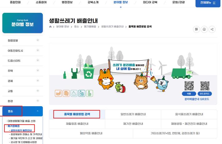 서울 강북구는 생활폐기물의 올바른 분리배출을 돕기 위해 구청 홈페이지에 ‘청소’ 메뉴를 신설하고, 주민 맞춤형 폐기물 분리배출 안내시스템을 운영한다고 밝혔다. 주요 기능은 품목별 검색으로, 9월 시범운영을 거쳐 10월부터 정식 운영에 들어간다.이번 사업은 생활폐기물 배출 과정에서 발생하는 혼란과 잘못된 배출로 인한 과태료 부과 사례를 예방하기 위해 추진됐다. 주민들이 보다 쉽고 정확하게 분리배출할 수 있도록 지원하는 것이 목표다.강북구청 홈페이지 ‘청소’ 메뉴의 ‘품목별 배출방법 검색창’에 고무장갑, 일회용컵, 옥수수대 등을 입력하면 ▲세척 필요 여부 ▲배출 방법 ▲주의사항을 한눈에 확인할 수 있다. 음식물 쓰레기·플라스틱·종이 등 혼동하기 쉬운 품목은 별도로 안내하고, 김장철·명절 등 계절별 집중 배출 품목은 시기에 맞춰 자료가 제공된다. 분리배출 규칙은 그림과 표로 알기 쉽게 표현하고 있고, 폐기물 관리 조례상 과태료 기준도 함께 확인할 수 있다.아울러 서울시 `내 손안의 분리배출` 앱과 연계해 모바일로도 편리하게 이용할 수 있으며, 분기별 자료 갱신과 신규 품목 반영을 통해 지속적으로 시스템을 개선해 나갈 예정이다.이순희 강북구청장은 “주민 맞춤형 안내시스템을 통해 주민 누구나 쉽고 편리하게 분리배출 방법을 확인할 수 있게 됐다”며, “앞으로도 주민 의견을 적극 반영해 기능을 고도화하고, 자원순환 도시 강북 실현에 최선을 다하겠다”고 말했다.