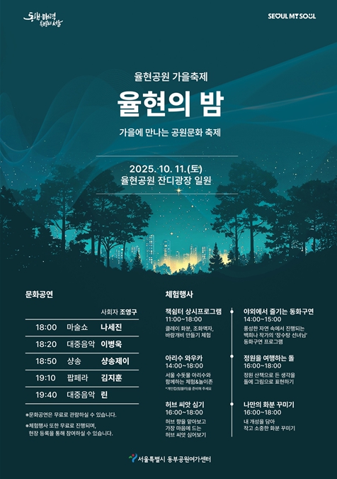 서울시는 강남구 세곡동에 위치한 율현공원에서 마술부터 가요까지 다양한 공연과 정원체험 프로그램을 만날 수 있는 가을 축제 ‘율현의 밤’을 10월 11일 선보인다. 정원을 여행하는 돌, 허브 씨앗 심기, 나만의 화분 꾸미기 등 정원체험 프로그램은 오후 4시부터 6시까지 진행된다. 축제의 하이라이트인 마술쇼, 샹송, 팝페라 그리고 린의 대중음악까지 가을 저녁의 감성을 선사할 공연은 오후 6시부터 8시까지 펼쳐진다. 전문 MC 조영구의 진행과 함께 성큼 찾아온 가을을 느낄 수 있다. 책쉼터에서는 오전 11시부터 오후 6시까지 클레이 화분, 조화액자, 바람개비 만들기 등 다양한 체험프로그램이 마련되어 있다. 오후 2시부터 3시까지 백희나 작가의 ‘장수탕 선녀님’ 등 동화구연도 진행된다. 책쉼터 앞에는 해치와 친구들 정원 포토존이 조성되어 가족과 함께 체험도 하며 특별한 사진을 남길 수 있다. 또한 오후 2시부터 6시까지 ‘아리수 와우카’에서는 아리수 시음과 체험프로그램이 진행되니 이벤트도 참여하고 무료 음료도 만나보자. 아리수 뿐 아니라 망고 주스, 청포도 주스, 아이스 아메리카노 등 맛있는 음료가 제공될 예정이다. 시음을 원하는 시민은 환경보호를 위해 개인컵(텀블러)을 가져오는 것이 좋다. 모든 공연과 체험프로그램은 현장에서 누구나 무료로 참여할 수 있으며, 일부 책쉼터 특별프로그램은 서울시 공공서비스 예약 누리집에서 9월 22일 오전 9시부터 사전예약할 수 있다. 박미성 동부공원여가센터소장은 “율현공원 가을축제에서 준비한 다양한 공연과 프로그램을 즐기며 문화가 흐르는 율현의 밤을 함께하길 바란다.”고 말했다.