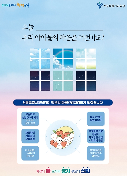 서울특별시교육청은 모든 학생의 정서적 안정을 실현하겠다는 교육청의 정책 방향과 실행 약속을 알리기 위해 ‘학생 마음건강(생명존중) 증진 캠페인’을 본격 추진한다.이번 캠페인은 학생 마음건강(생명존중)의 중요성에 대한 사회적 관심을 높이고, 대국민 캠페인을 통한 서울시교육청 정책 공감도 향상을 위해 마련됐다.‘학생 마음건강(생명존중) 증진 캠페인’은 공익광고(지면, 온라인), SNS(블로그, 인스타그램), 유튜브, 틱톡 콘텐츠 등을 통해 9월부터 10월까지 2개월간 순차적으로 진행될 예정이며,‘학생들의 마음건강지킴이가 되겠다’는 서울시교육청의 약속을 담아, ‘서울 학생 마음건강 증진 사업’의 주요 내용인 ▲모든 학교 상담(교)사 배치 ▲모든 학년 사회정서교육 운영 ▲서울학생통합콜센터 및 응급지원단 운영 ▲심리정서치유센터 ‘마음치유학교’ 구축 등 정책을 집중 홍보한다.정근식 서울특별시교육감은 “학생 마음건강 증진 및 생명존중을 위한 전국민 캠페인이 필요하다”며 “학생들의 마음건강은 개인의 문제를 넘어 사회 전체의 과제로, 이번 캠페인을 통해 학생 마음건강의 중요성과 생명존중 문화가 학교와 지역사회 전반에 확산될 수 있도록 최선을 다하겠다”고 밝혔다.
