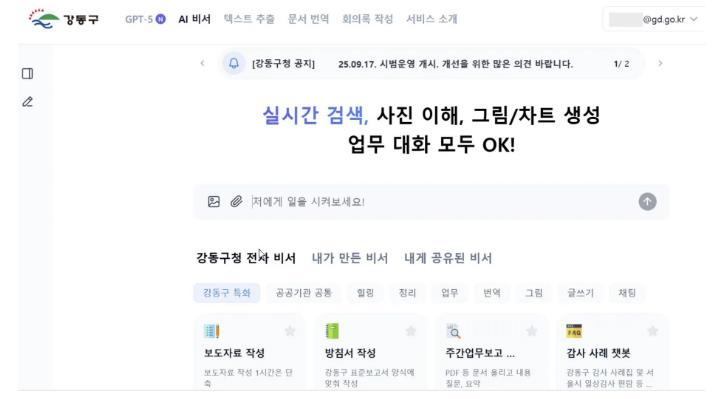 강동구는 구정 전반의 업무 효율성과 생산성을 획기적으로 높이기 위해 지난 17일부터 전 직원을 대상으로 ‘생성형 AI 업무 지원 서비스’의 시범 운영에 들어갔다고 22일 밝혔다.‘생성형 AI 업무 지원 서비스’는 강동구가 최신 생성형 인공지능(AI) 모델인 GPT-5을 기반으로 다양한 실무에 적용할 수 있도록 구축한 통합 플랫폼이다.특히, 이 서비스에는 구 스마트도시과 담당 직원들이 오픈 소스 모델과 검색 증강 생성(RAG) 기술 등을 활용해 강동구 행정업무에 맞도록 직접 개발한 업무 특화 챗봇이 도입됐다. 현재 도입된 특화 챗봇은 핵심 내용을 입력하면 양식에 맞춰 초안을 작성하는 ‘방침서 작성 봇’, ‘주간 업무 작성 봇’, ‘보도자료 작성 봇’을 비롯해, 구와 타 기관의 감사 사례를 안내해 재발을 방지하는 ‘감사 사례 봇’, 복잡한 정보공개 청구 절차와 규정을 안내하는 ‘정보공개처리 안내 봇’ 총 다섯 가지로, 특정 업무의 효율성을 더욱 극대화할 것으로 기대된다.구는 이번 시범 운영을 통해 범용 AI 서비스와 특화 챗봇의 활용 가능성을 검증하고, 직원들의 목소리를 반영하여 시스템을 지속적으로 고도화해 나갈 방침이다.이수희 강동구청장은 “이번 생성형 AI 업무지원 서비스 도입은 단순한 시스템 구축을 넘어, 직원들이 직접 기술을 탐구하고 실제 업무에 필요한 기능을 만들어낸 혁신이라는 점에서 더욱 뜻깊다”라며, “AI라는 든든한 조력자를 통해 직원들의 업무 부담은 덜어주고, 그 역량을 구민의 삶을 바꾸는 더 나은 정책을 만드는 데 집중시켜 구민이 체감하는 행정서비스의 질을 높여나가겠다”라고 밝혔다.