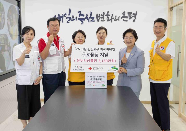 서울 은평구는 지난 17일 대한적십자사 서울지사로부터 수해 피해 복구 후원금으로 온누리상품권 2천1백50만 원을 전달받았다고 밝혔다.이번 후원금은 한국대부금융협회가 서울시 수해 피해 복구를 위해 대한적십자사에 기부한 기금을 통해 마련됐다.전달식에는 김미경 구청장을 비롯해 대한적십사자 서울특별시지사 권영규 회장과 대한적십자사봉사회 은평구협의회 나해숙 회장, 대한적십자사 서북봉사관 박지연 관장 등 관계자 7명이 참석했다.권영규 대한적십자사 서울특별지사 회장은 “뜻하지 않은 수해로 큰 어려움을 겪은 은평구민들에게 깊은 위로를 전한다”며 “앞으로도 재난 현장에서 구민들과 함께하며 구호 활동에 최선을 다하겠다”고 말했다.김미경 은평구청장은 “지난 8월 수해 당시 적십자사가 가장 먼저 달려와 복구 지원과 세탁 차량을 지원해 주셔서 큰 힘이 됐다”며 “기부금을 후원해 주신 한국대부금융협회에도 감사드리며, 이번에 전달받은 온누리상품권은 취약계층 수해 구민들의 회복을 위해 소중히 사용하겠다“고 밝혔다.은평구는 이번 전달받은 온누리상품권을 수해 피해를 입은 관내 취약계층 총 215가구에 각 10만 원씩 전달할 예정이다.
