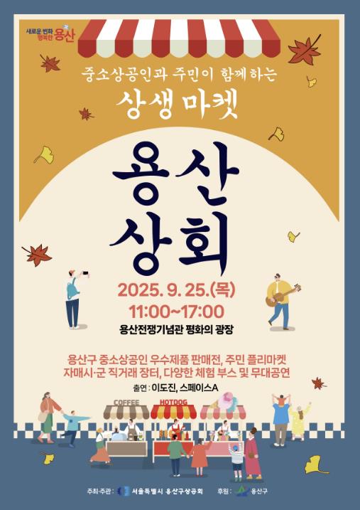 서울 용산구가 오는 25일 오전 11시~오후 5시 전쟁기념관(이태원로 29) 평화의 광장에서 (사)용산구상공회 주최로 열리는 중소상공인과 주민이 함께하는 상생마켓 ‘용산상회’를 후원한다.경기 침체 등으로 어려움을 겪는 중소상공인들에게 제품을 홍보하고 판로를 넓힐 기회를 제공하고, 주민 간 소통과 화합의 장을 만들기 위해 마련된 자리다.이번 용산상회는 ▲지역 내 중소상공인 우수제품 ▲사회적경제기업 및 자활근로사업단 판매부스 ▲자매시·군 직거래 장터 ▲주민 벼룩시장 ▲구 부녀회 음식 부스 ▲체험부스 등 총 45개의 다양한 부스로 방문객을 맞는다.지역 내 중소상공인, 사회적경제기업, 자활근로사업단에서는 재화, 의류, 공예품 등 우수한 상품을 전시하고 판매한다. 구 관계자는 “이번 행사에서 기업의 우수제품 홍보는 물론, 방문객들께는 양질의 제품을 합리적인 가격에 구매할 수 있는 기회를 제공하고자 한다”라고 설명했다.또한 충북 제천시 등 7개 자매시·군과 함께하는 직거래장터를 마련해 사과, 꿀, 한과류 등 다양한 농특산물을 주민들에게 저렴한 가격에 제공하고 도시와 농어촌 간 교류 촉진에 기여할 방침이다.상인 뿐만 아니라 주민들이 모여 중고물품을 사고파는 주민 소통과 화합의 장 또한 마련됐다. 체험부스는 △인공지능(AI) 솜사탕 자판기 △풍선공예 △라탄공예 △3D펜 그리기 △가상현실(VR) 체험 △4컷사진 △재활용 화분 만들기 △심폐소생술 교육 등으로 열린다.무대에서는 초대가수 이도진, 스페이스A 공연을 비롯한 다양한 공연이 준비됐다. ‘우리누리 풍물단’과 ‘춤추는 난타’ 주민공연, △퓨전국악 △탭댄스 △마술 △대중가요 등 버스킹도 무대에 오른다.박희영 용산구청장은 “이번 용산상회 행사가 지역경제 활성화와 중소상공인의 성장에 도움이 되는 좋은 계기가 되기를 바란다”라며 “이번 행사의 주제가 ‘상생’인 만큼 앞으로도 지역 상인, 주민 등이 함께 성장하고 어울릴 수 있는 환경 조성에 힘쓰겠다”라고 전했다.